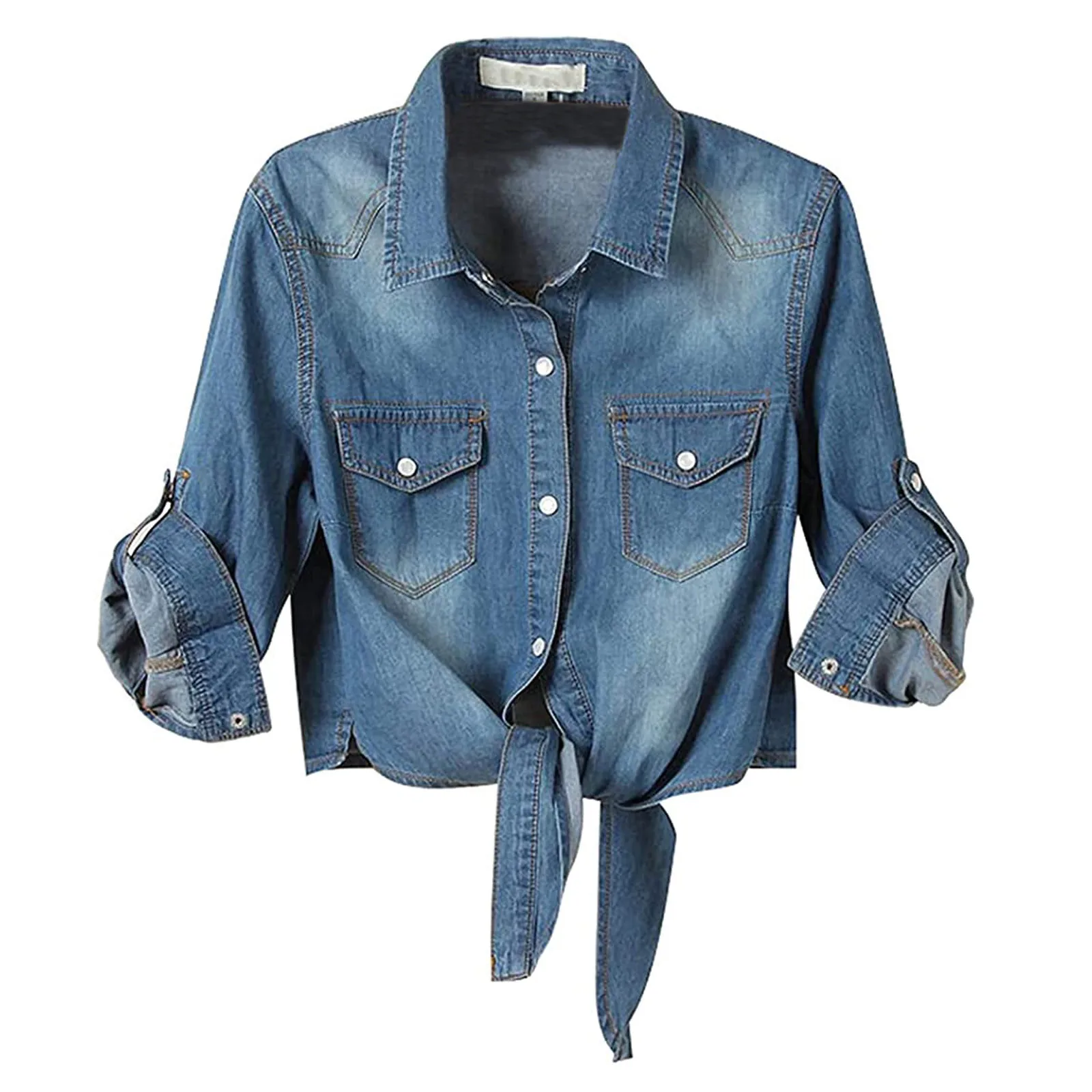 Элегантная Джинсовая блузка, женское джинсовое пальто, Повседневная укороченная джинсовая рубашка на пуговицах с рукавом 34 и узлом, куртка из денима для женщин