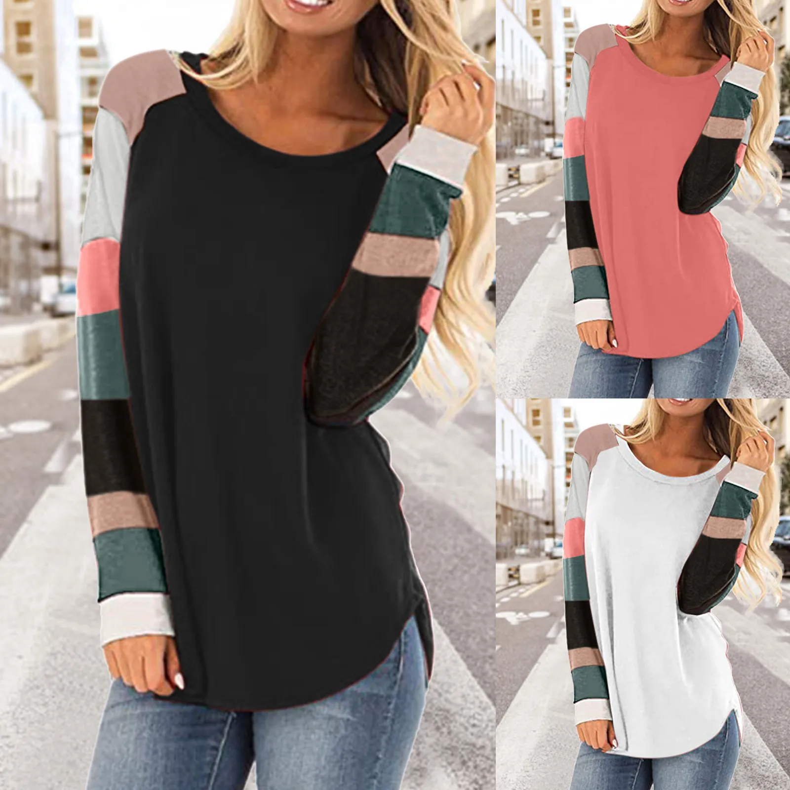 Женская футболка с длинным рукавом и круглым вырезом, однотонная свободная уличная туника в полоску с пэчворком и пуговицами, Осенние Топы для женщин, 2021
