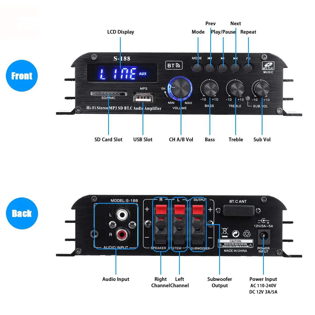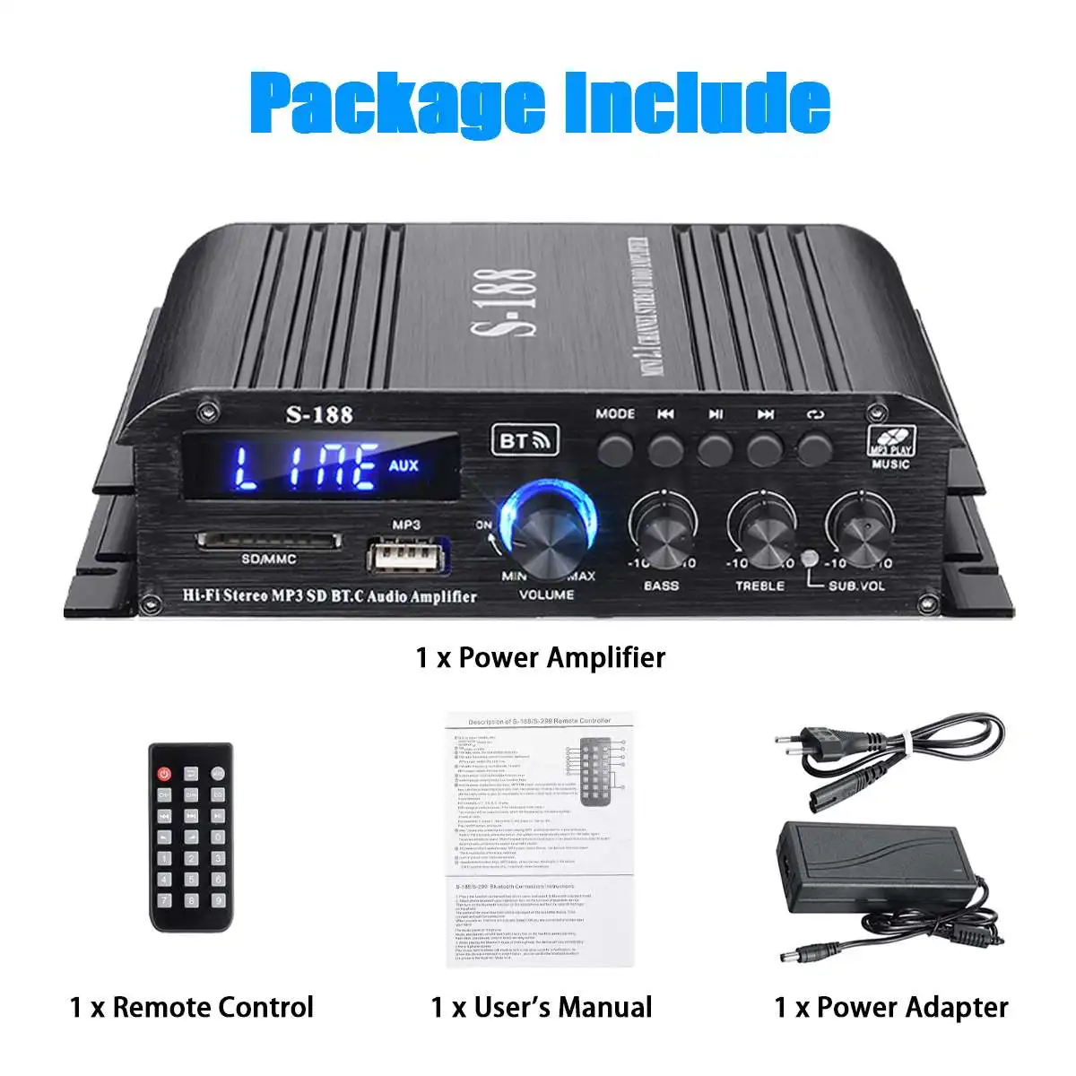 Особенности:-Мини HIFI Цифровой bluetooth аудио усилитель мощности.-Встроенный ЖК-дисплей с функцией подсветки.-Sd-карта, u-диск, AUX, MP3 формат воспроизведения, Поддержка беспроводного подключения bluetooth.-2,1 выходной канал, можно подключить 1 пары колонок и 1 сабвуфер.-С высокими частотами, басами и регулятором громкости, очень прост в использовании.-Низкое Искажение обеспечивает более четкий, сильный и мощный звук.-Два выхода основного канала.-С функцией дистанционного управления.-Питание переменного/постоянного тока, подходит для вашего дома и автомобиля.