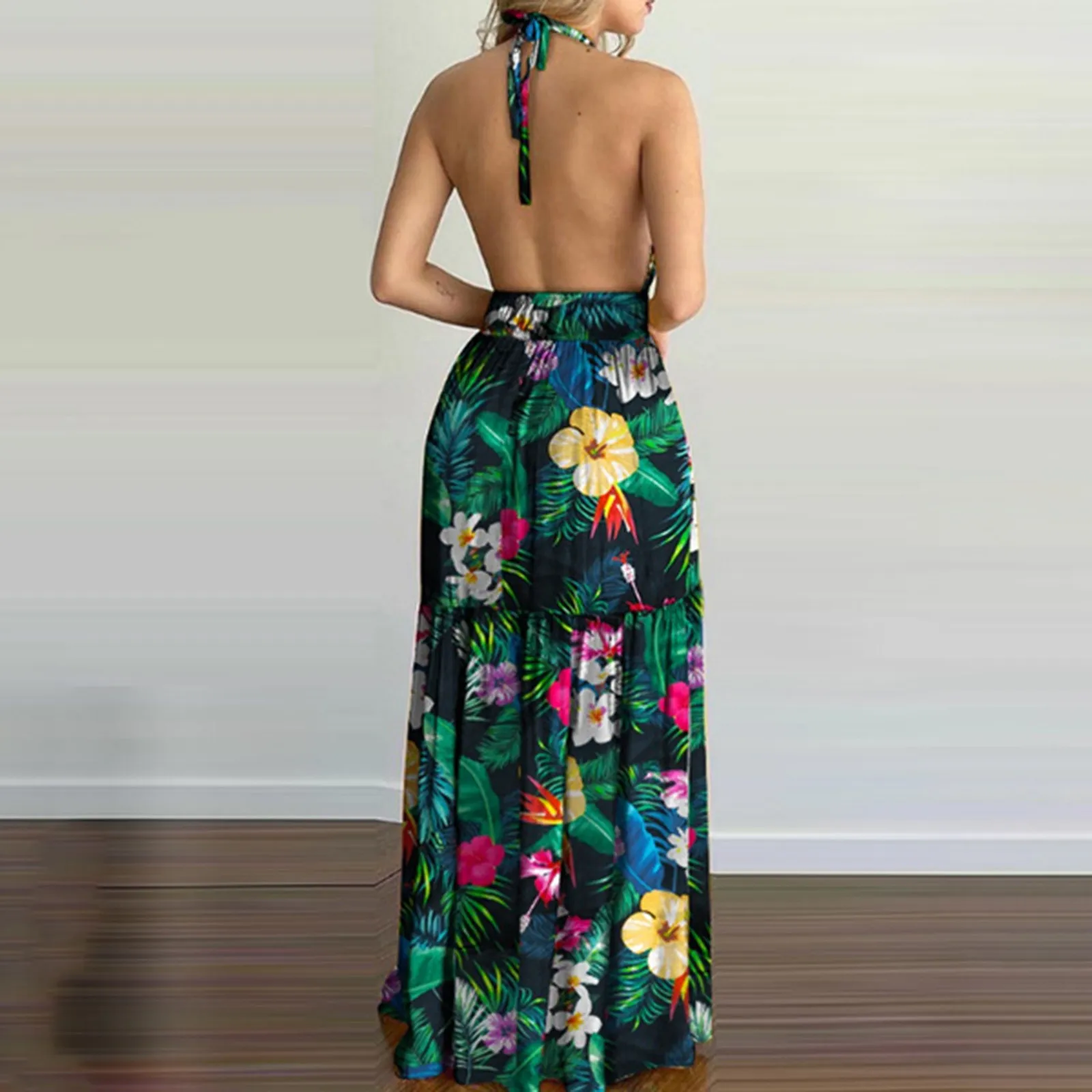 Женское платье макси с тропическим принтом, с открытой спиной, с гл...