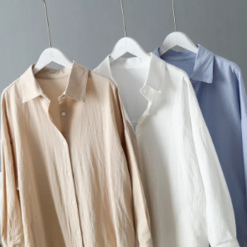Женская свободная рубашка средней длины из хлопка и льна, Солнцезащитная блузка с лацканами и рукавами средней длины, с пуговицами и оборками на подоле, лето 2021