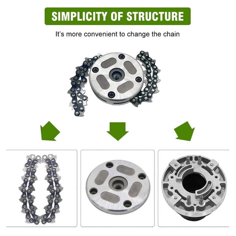 Особенности:1. Головка триммера изготовлена из высококачественного металлического материала, прочная и долговечная, обеспечивая длительный срок службы.2. Практичный сменный аксессуар для вашего триммера.3. Структура цепи делает головку триммера более гибкой.4. Легко установить и удобно использовать.5. Идеально подходит для использования в саду или сельском хозяйстве.