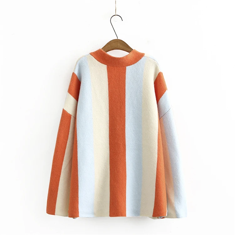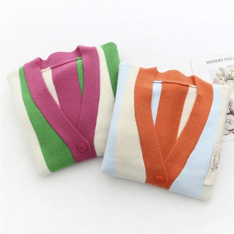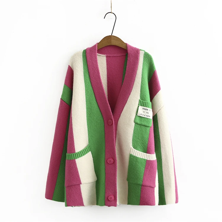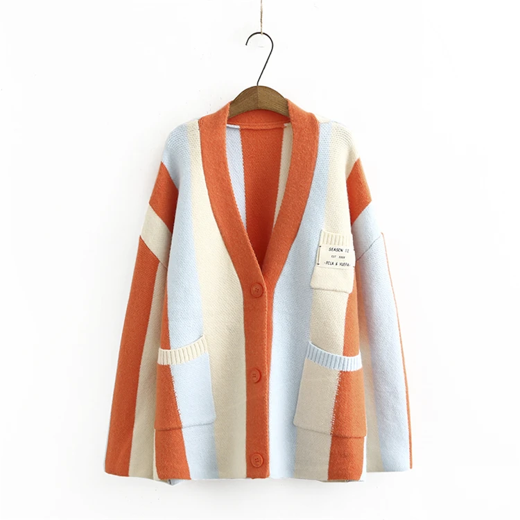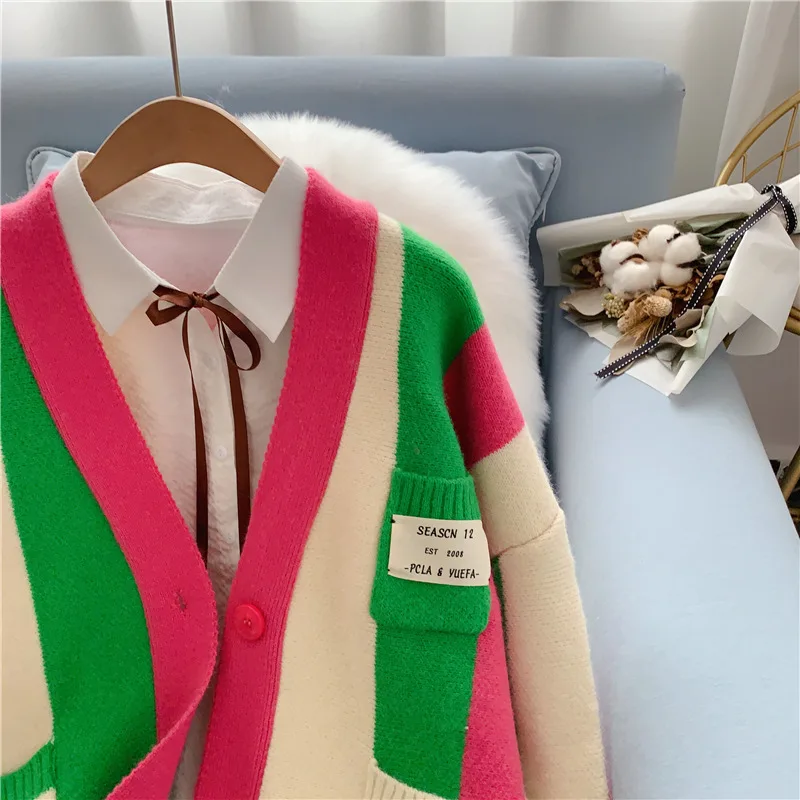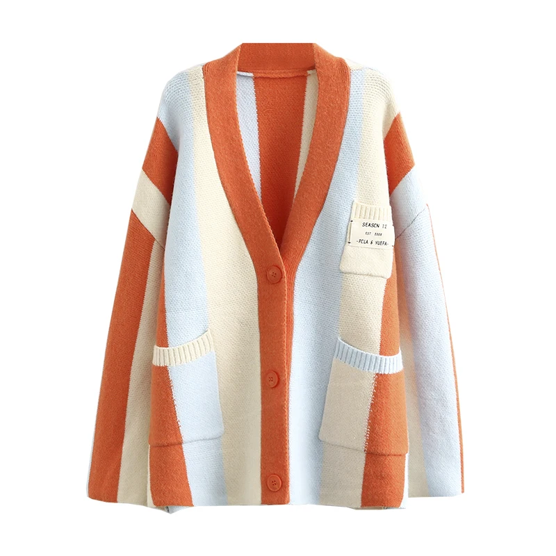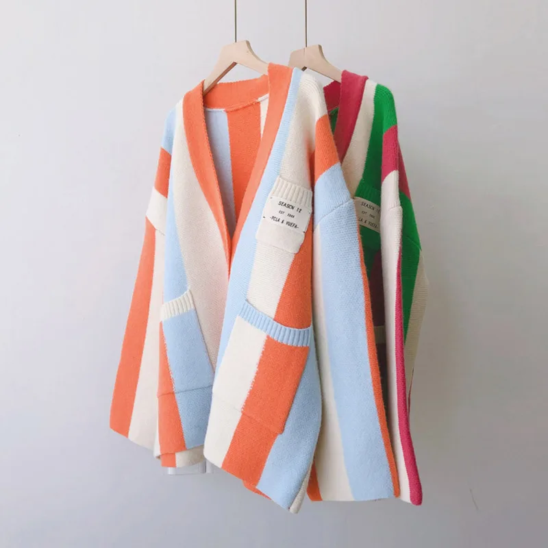 Женский однобортный Кардиган в полоску, свободный трикотажный свитер в Корейском стиле с V-образным вырезом, осень 2021