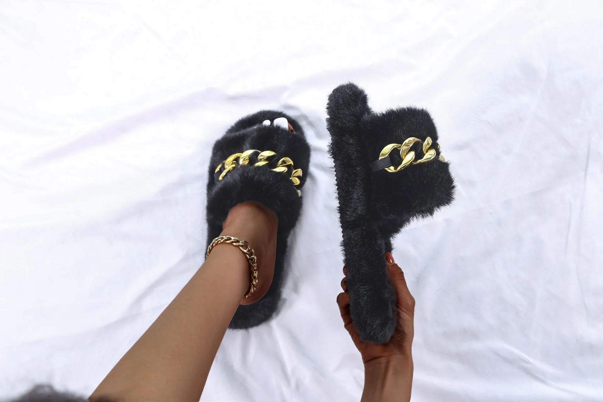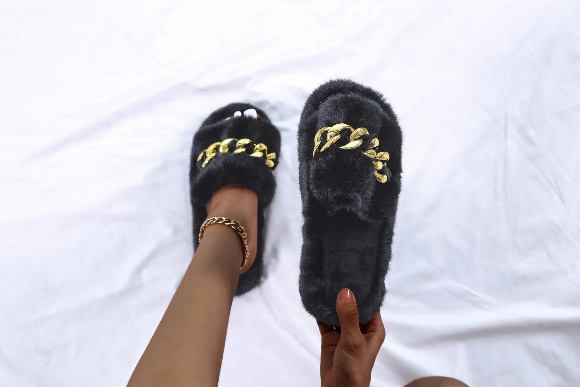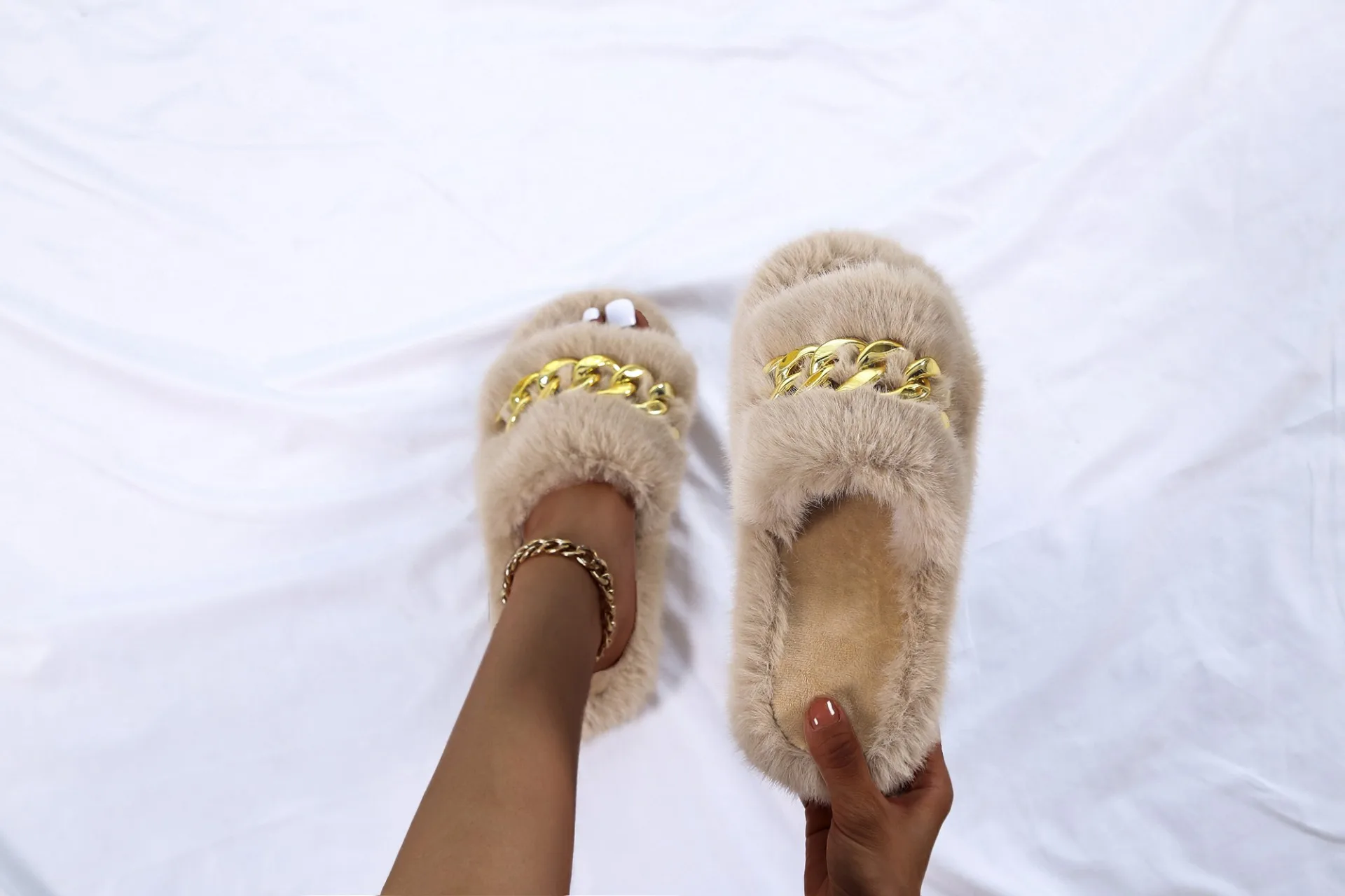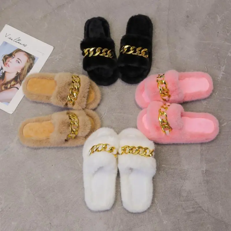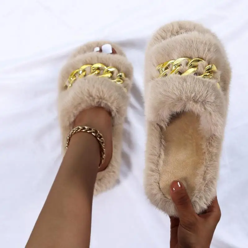 Меховые сланцы, плюшевые шлепанцы с золотой цепочкой, дизайнерские ...