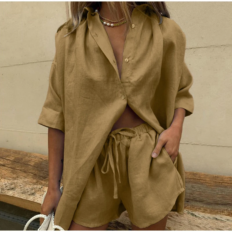 Женский костюм из хлопка и льна, однотонный костюм из рубашки с вор...