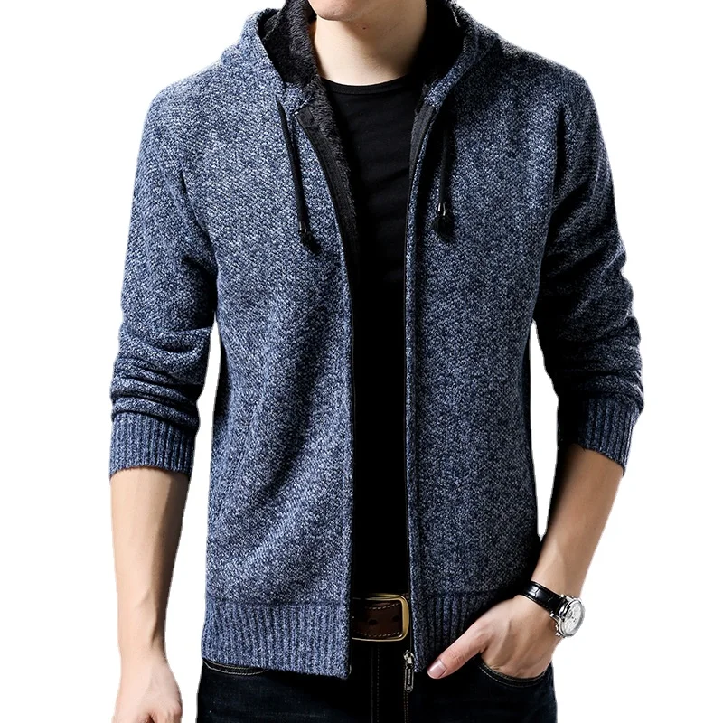 Мужской трикотажный кардиган с капюшоном, теплый плотный джемпер приталенного силуэта, повседневная одежда