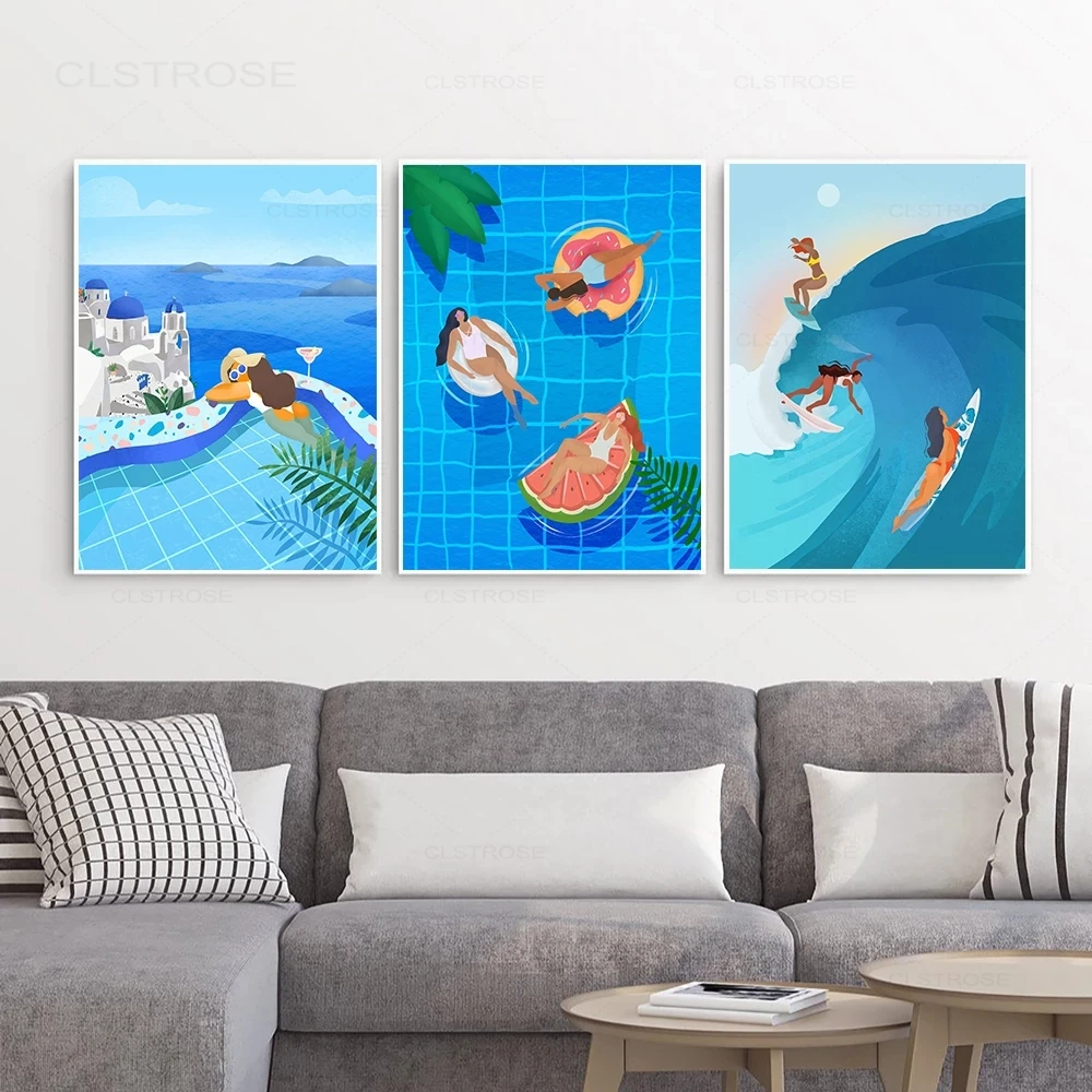 Марокканский постер для путешествий, плавания у бассейна, Дамский постер, Марракеш, рисунок на холсте, летняя тропическая Настенная картина, картина, домашний декор