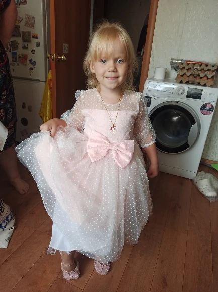 Платье бомбезное! Качественно сшито, на Валдбирисе точно такое по цене 4 500 рублей. На девочку ростом 116 см, подошёл размер 5Т(120см).Немножко широкое в груди, но это решимо, если ушить по бокам. Платье дошло до Вологодской области за 10 дней, что очень обрадовало.