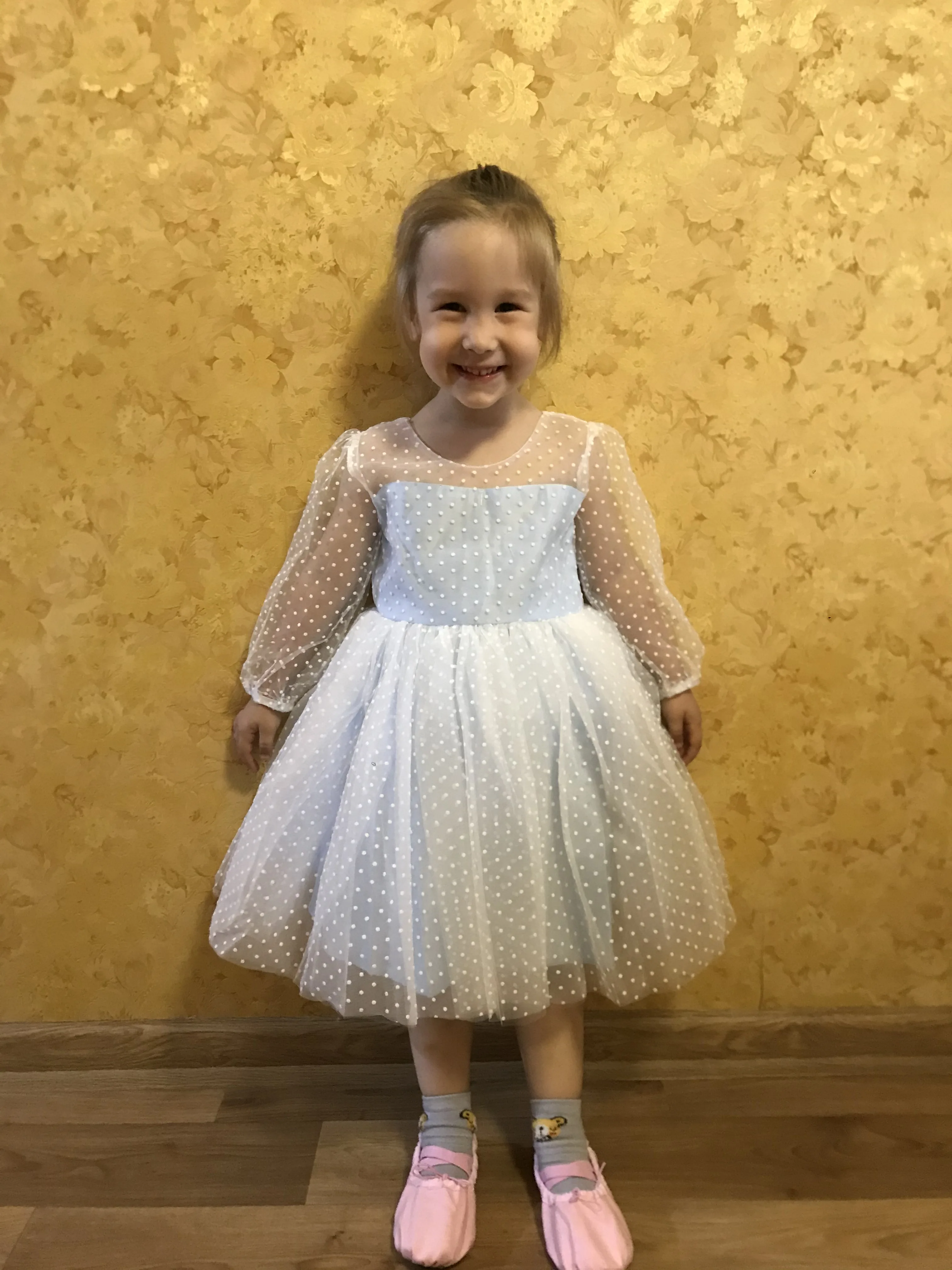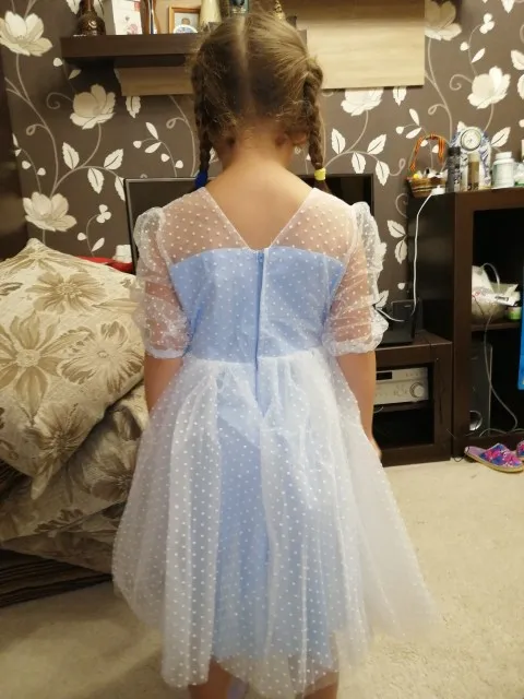Платье классное,сшито прилично,подклад на груди ХБ. Пришло очень быстро, раньше положенного,сложено аккуратно,запаха нет Есть маленькая дырочка(Дочке 5 лет,ростом 105 см село хорошо,но запас не большой в обхвате груди Размер 5Т(120см)В талии свободно и она завышена у данной модели