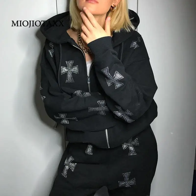 Y2k Стразы готический костюм из 2 предметов хип-хоп толстовка с дли...