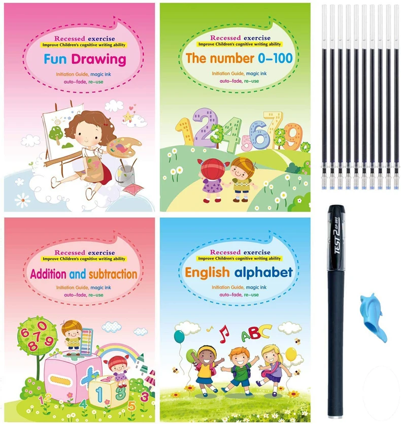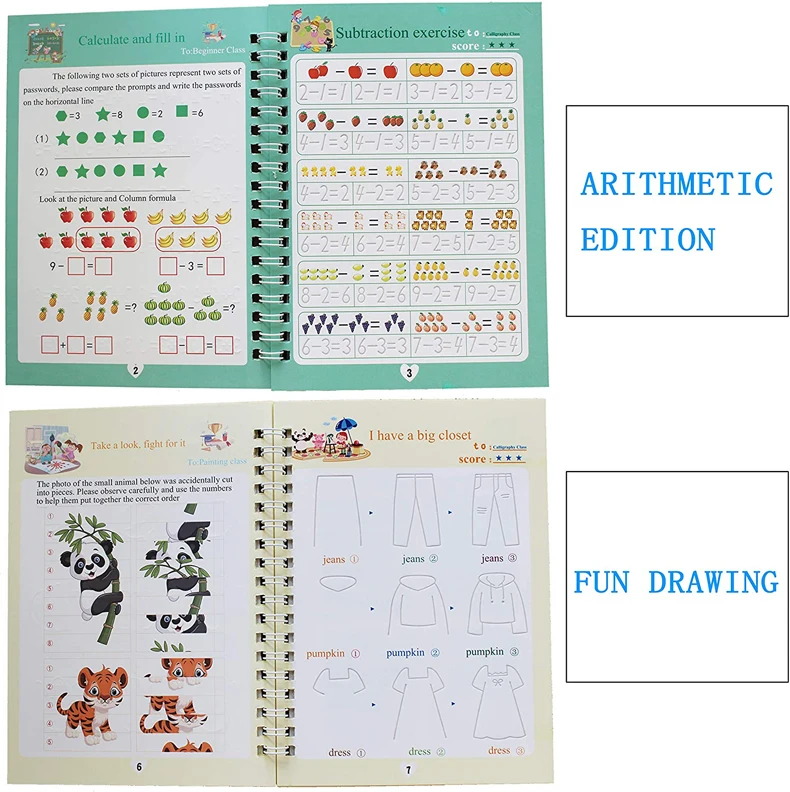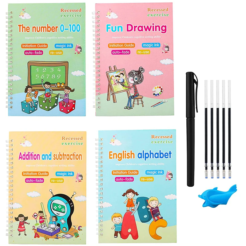 1. Удобное сочетаниеЭта посылка содержит 4 части английской волшебной тетрадь для практики, включая цифровое издание, забавный рисунок, Английский алфавит и арифметическое издание, также предлагается 1 набор автоматических выцветающих ручек, удобный набор комбинации для вас2. Надежный и удобныйИзготовлен из качественного материал картона, этими магическими письменной форме книги надежны в использовании и очень приятна на ощупь, прочный, чтобы писать; Каждая книга размеры около 5,1x7,5 дюймов/13x19 см, достаточно места для детей, чтобы практиковать написание, пожалуйста, проверьте размер перед покупкой3. Забавный, но практичныйБлагодаря трехмерному дизайну паза, эти книги для отслеживания почерка могут стандартизировать стандартный формат письма, весело, но практично для детей, чтобы использовать в повседневной жизни, повышают интерес: эти волшебные книги каллиграфии имеют забавную графическую комбинацию, яркие цвета и милые формы, которые могут повысить память и интерес ребенка, Приносит им много удовольствия, дети могут многому научиться от него4. Применяется повторноБлагодаря этим автоматическим выцветающим ручкам текст в книге может автоматически исчезнуть через 10 минут, что означает, что дети могут много раз применять магическую каллиграфию, а также больше не беспокоиться о ошибках