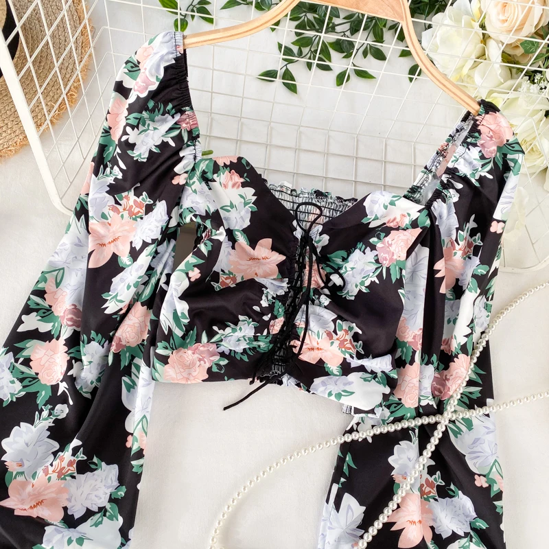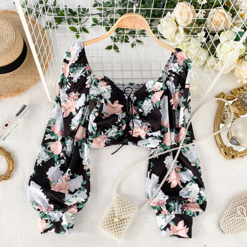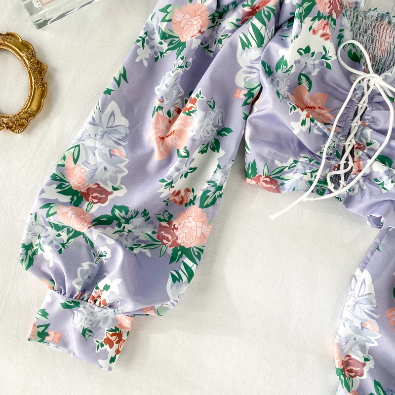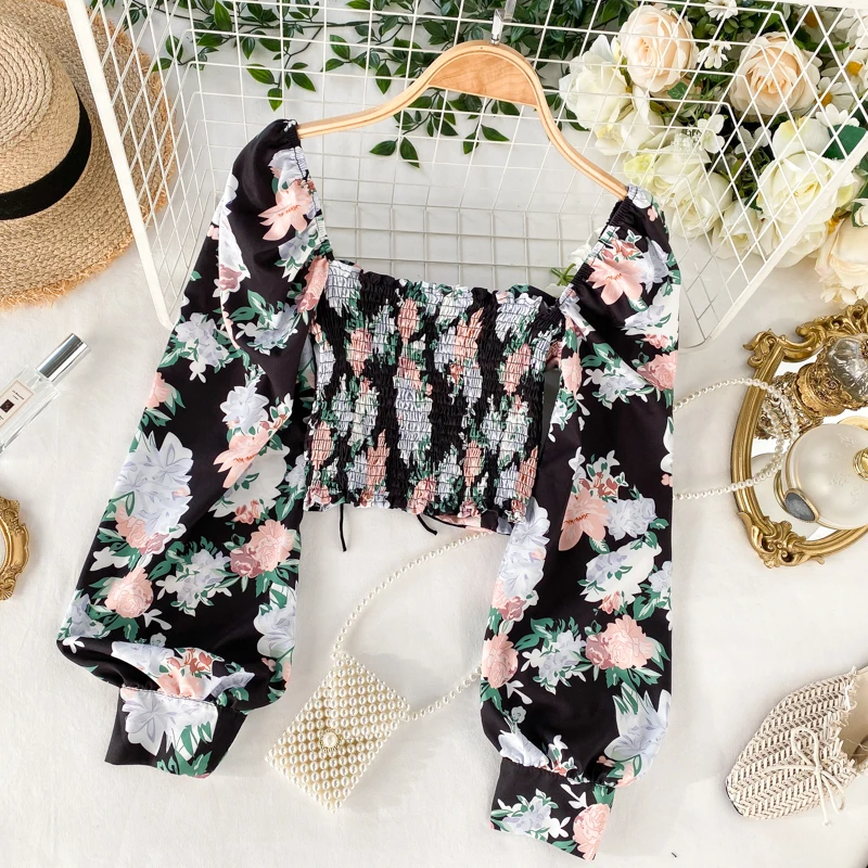 Женский винтажный топ в дворцовом стиле, короткий эластичный Топ с квадратным вырезом и принтом, Облегающая рубашка во французском стиле, на лето