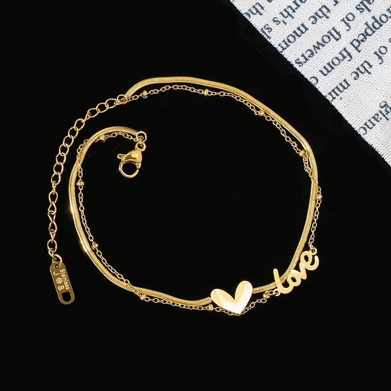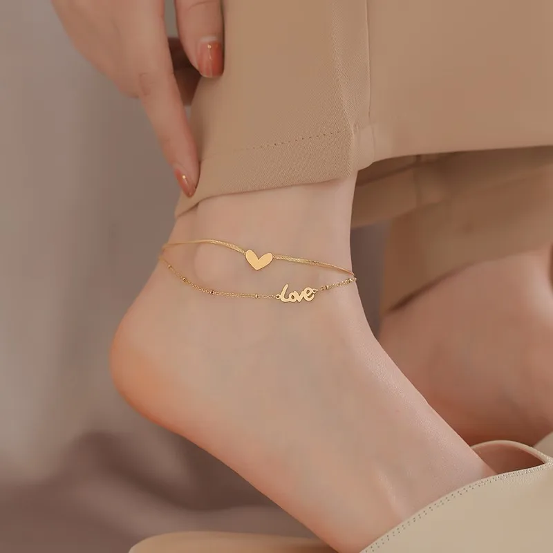 Браслет на ногу женский из нержавеющей стали, двухслойный браслет на ногу в форме сердца, ножная цепь золотистого цвета, Подарочная бижутерия, GA201