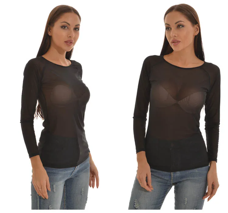 Модная прозрачная одежда для женщин, облегающий сексуальный черный сетчатый топ, уличная одежда, прозрачная высококачественная повседневная футболка с длинным рукавом