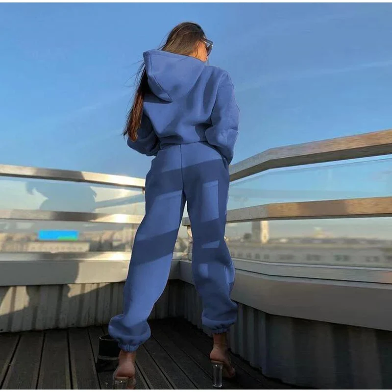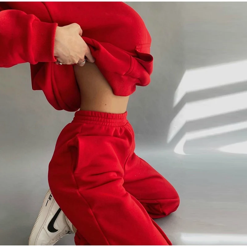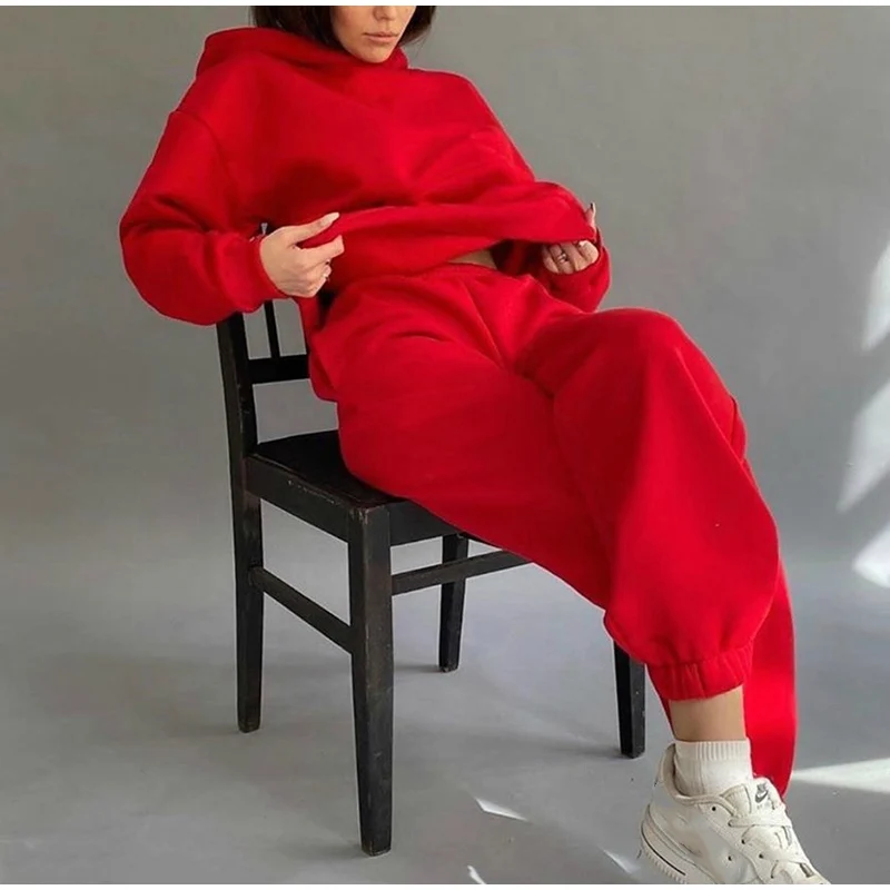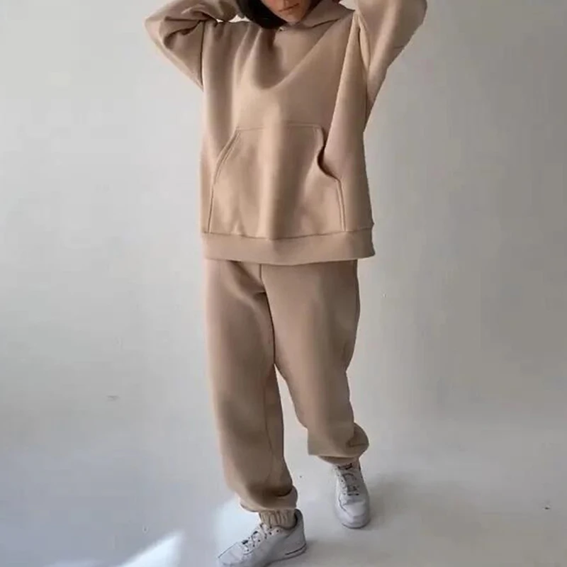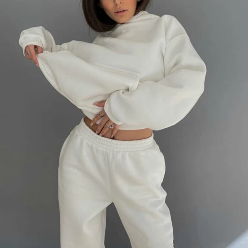 Флисовый однотонный комплект с толстовкой и брюками для женщин, осень 2021, пуловеры с передним карманом, длинные брюки, костюмы, женский Повседневный модный спортивный костюм