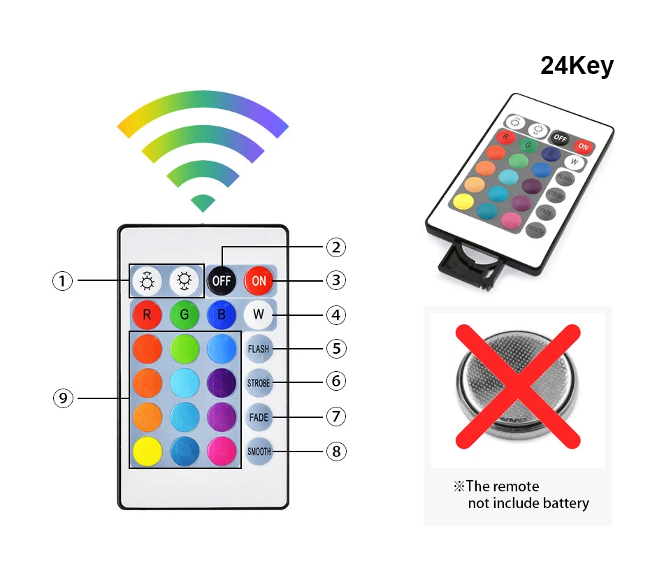 ①Brightness Плюс/минус ②Off переключатель ③On переключатель ④RGB цвета ⑤Flash ⑥Strobe ⑦Fade ⑧Smooth ⑨ 12 видов цветов