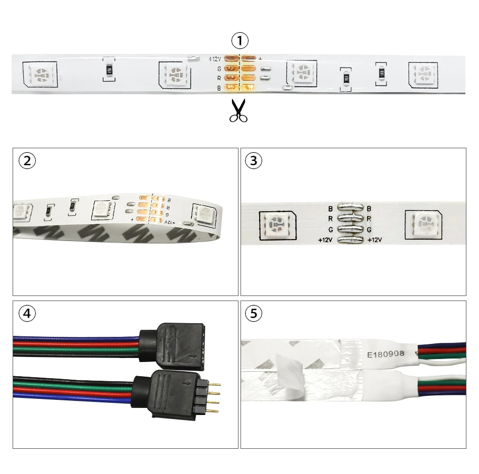 ① 3 led cut ②DC 12V Гибкая полоса ③ сварочная пайка каждым 0,5 m ④коннектором является положительным электродом ⑤клей 3M Двусторонняя клейкая лента