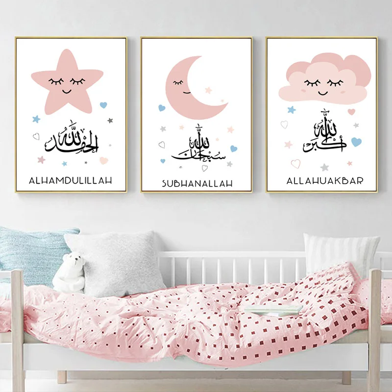 Исламский аллуху Акбар луна звезды розовый детский постер на холсте картина на стену художественные картины для девочек Декор детской комнаты