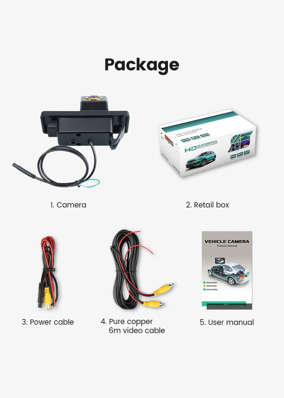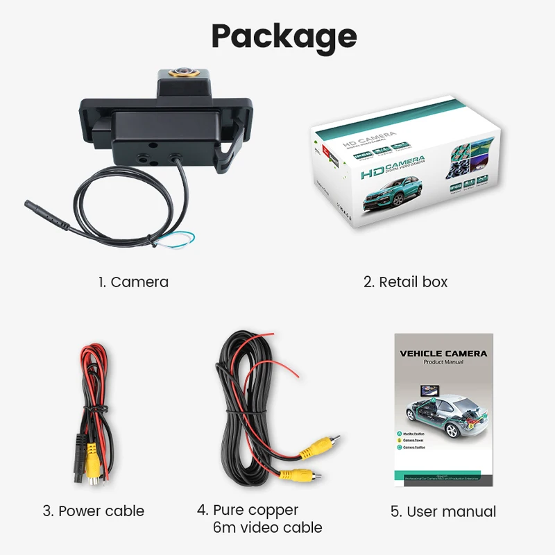 1. Камера заднего вида2. Розничная коробка3. Кабель питания4. Чистый медный 6 м видео кабель5. Руководство пользователя