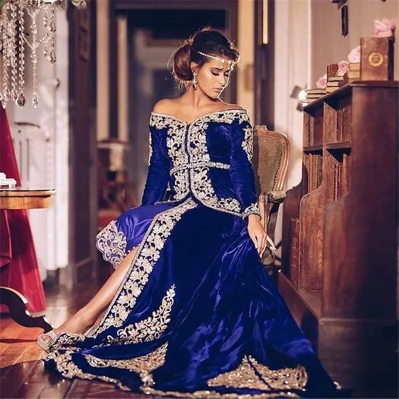 Ярко-синее бархатное платье для выпускного вечера с длинным рукавом и кружевной аппликацией, алжирский кафтан, арбический вечерний Халат
