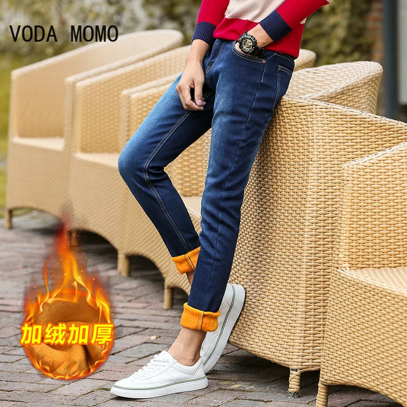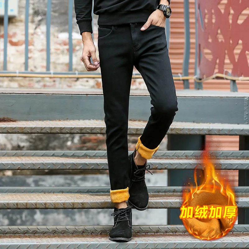Джинсы мужские облегающие, Стрейчевые плотные бархатные брюки, повседневные теплые джинсы с флисовой подкладкой, черные эластичные синие джинсы