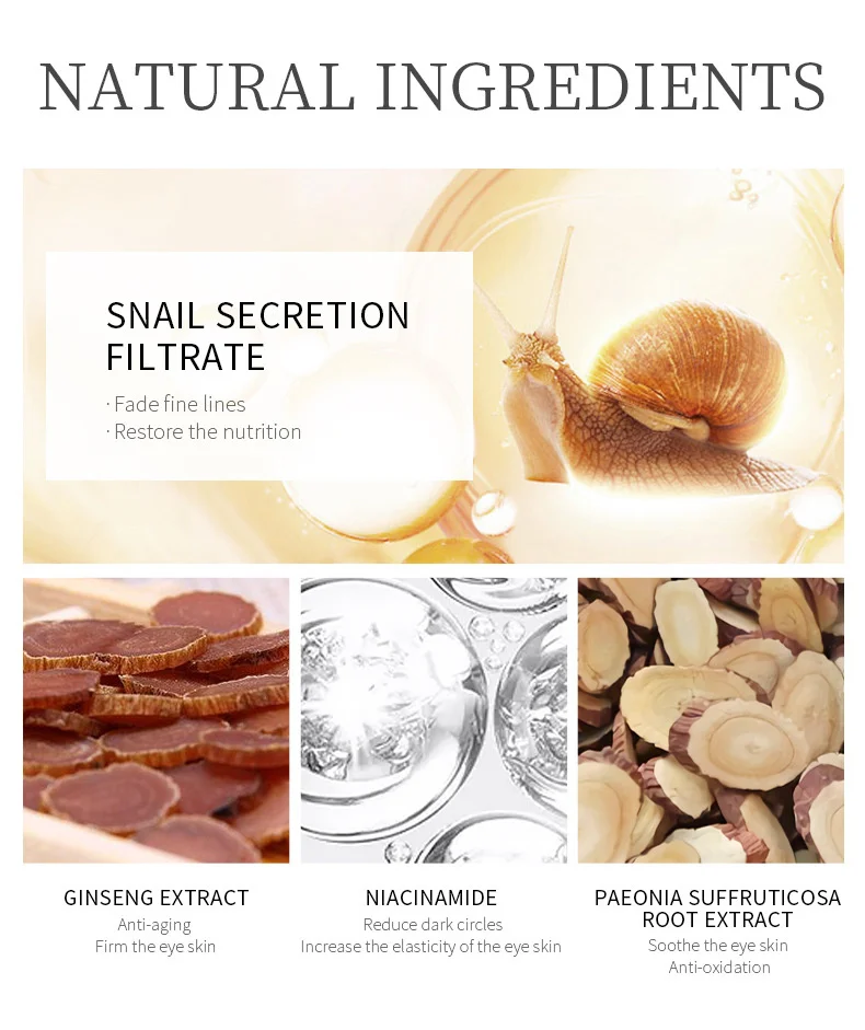 Набор для ухода за лицом с улиточным коллагеном①Этот французский крем-эссенция улитки богат эссенцией улитки, гиалуроновой кислотой и экстрактом тремеллы. Он может увлажнить сухую кожу, восстановить поврежденную кожу и повысить эластичность кожи. Он может обдумывать проблемы кожи, такие как грубая кожа, тусклая кожа и тонкие линии. Длительное использование может смягчить молодость кожи.② 24K Золотая сыворотка улитки содержит фильтрат секреции улитки и Ниацинамид, которые могут обеспечить влагу и питательные вещества. Он может эффективно уменьшить шероховатость, восстановить сухую и свободную кожу, сделать вашу кожу сияющей и яркой.③Содержащий секрецию улитки фильтрат и экстракт женьшеня редиса этризомы рубры, LAIKOU Женьшень крем для глаз с улиточной слизью может увлажнить и укрепить кожу глаз. С драгоценным экстрактом ниацинамида и паеонии Suffruticosa корня, он может выцветать тонкие линии и уменьшить темные круги, сделать ваши глаза молодыми и яркими.