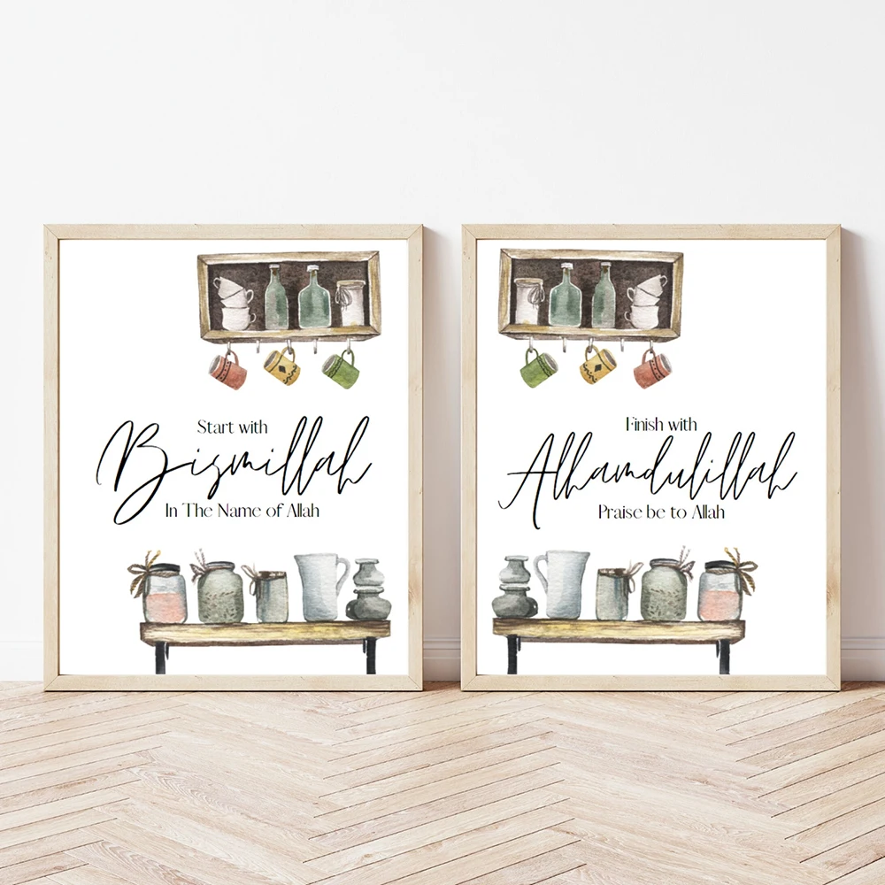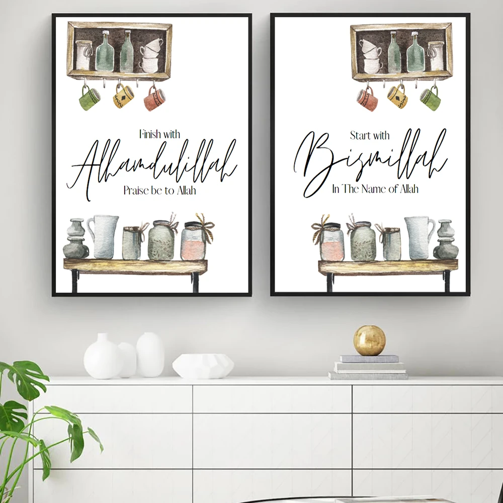 Исламский плакат и печать, начиная с конца бисмиллы с альхамдуллиллой, арабское настенное искусство, холст, картины, картины, кухонный Настенный декор