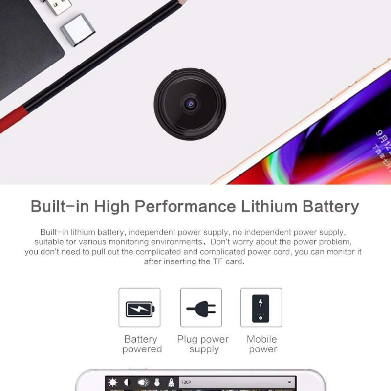 Эта маленькая камера с жестким зарядным кабелем и волшебным основанием, при зарядке во время записи, вы можете вручную повернуть угол записи на 360 градусов.