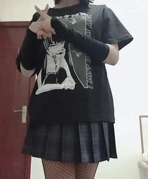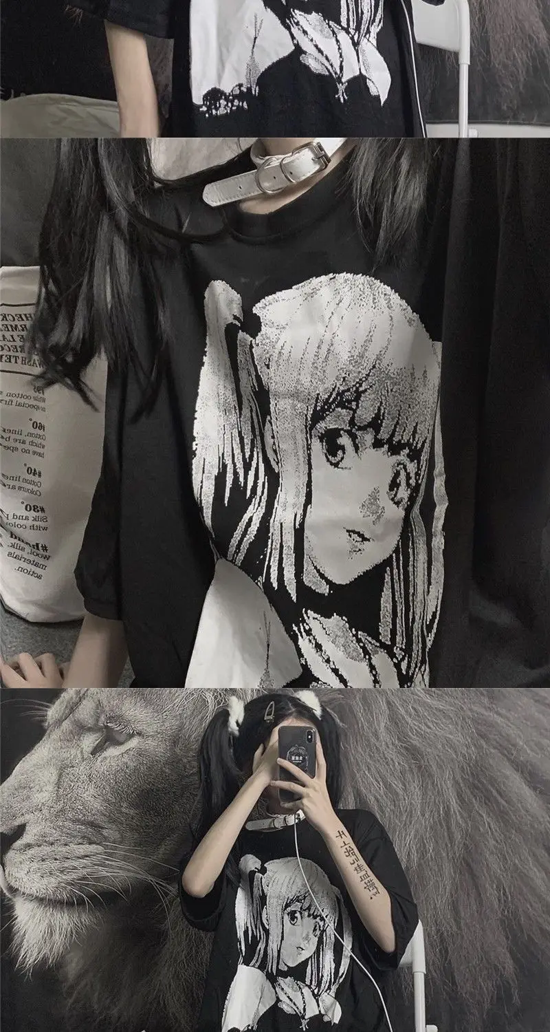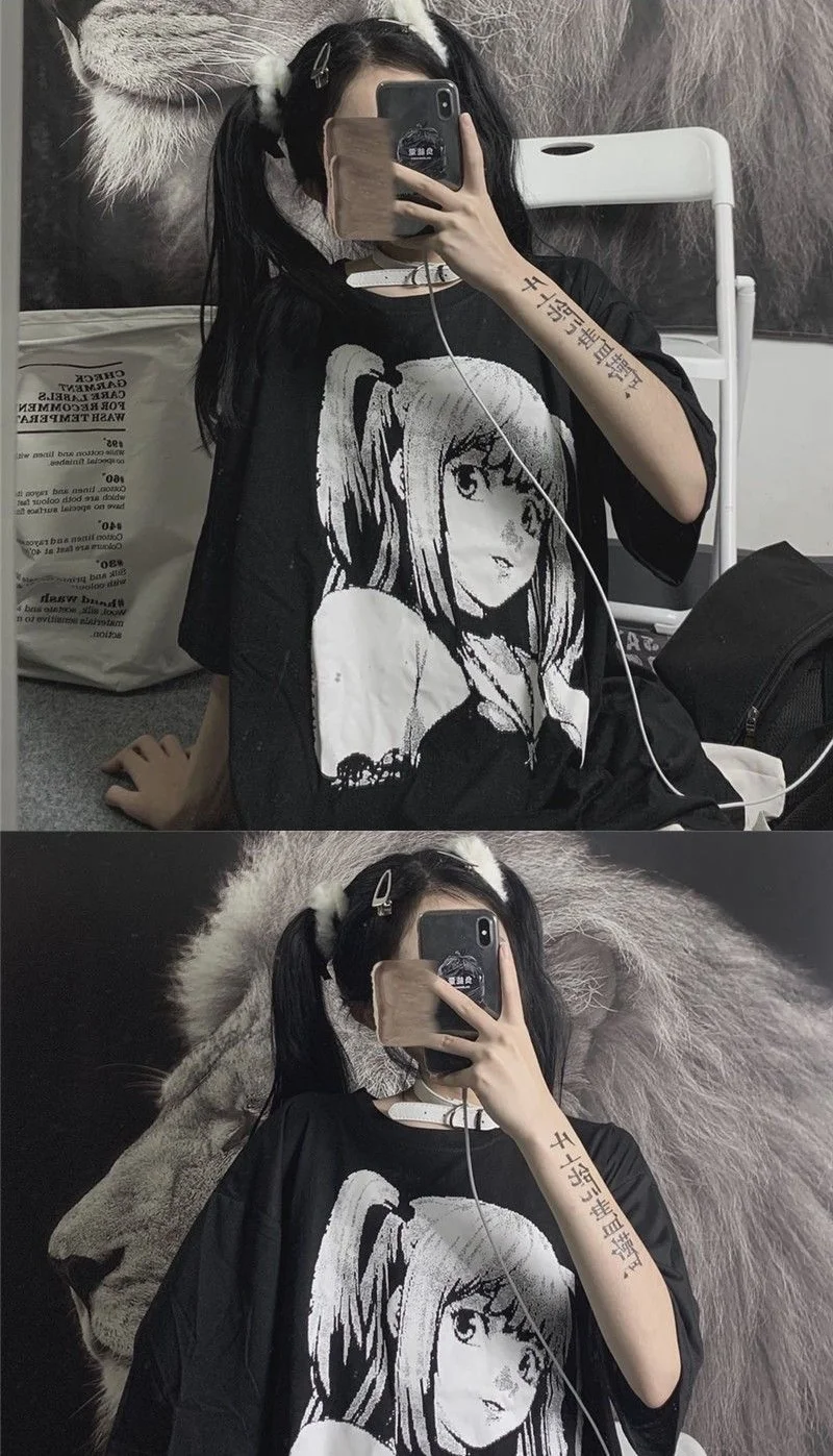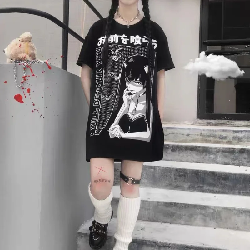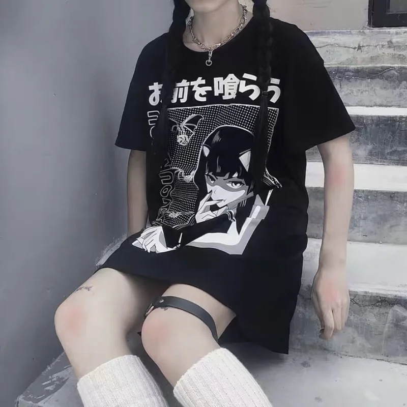 QWEEK, в японском стиле, топ для девочек, женские футболки с аниме принтом, женские черные готические Графические футболки 2021, летняя одежда, в стиле панк, шик