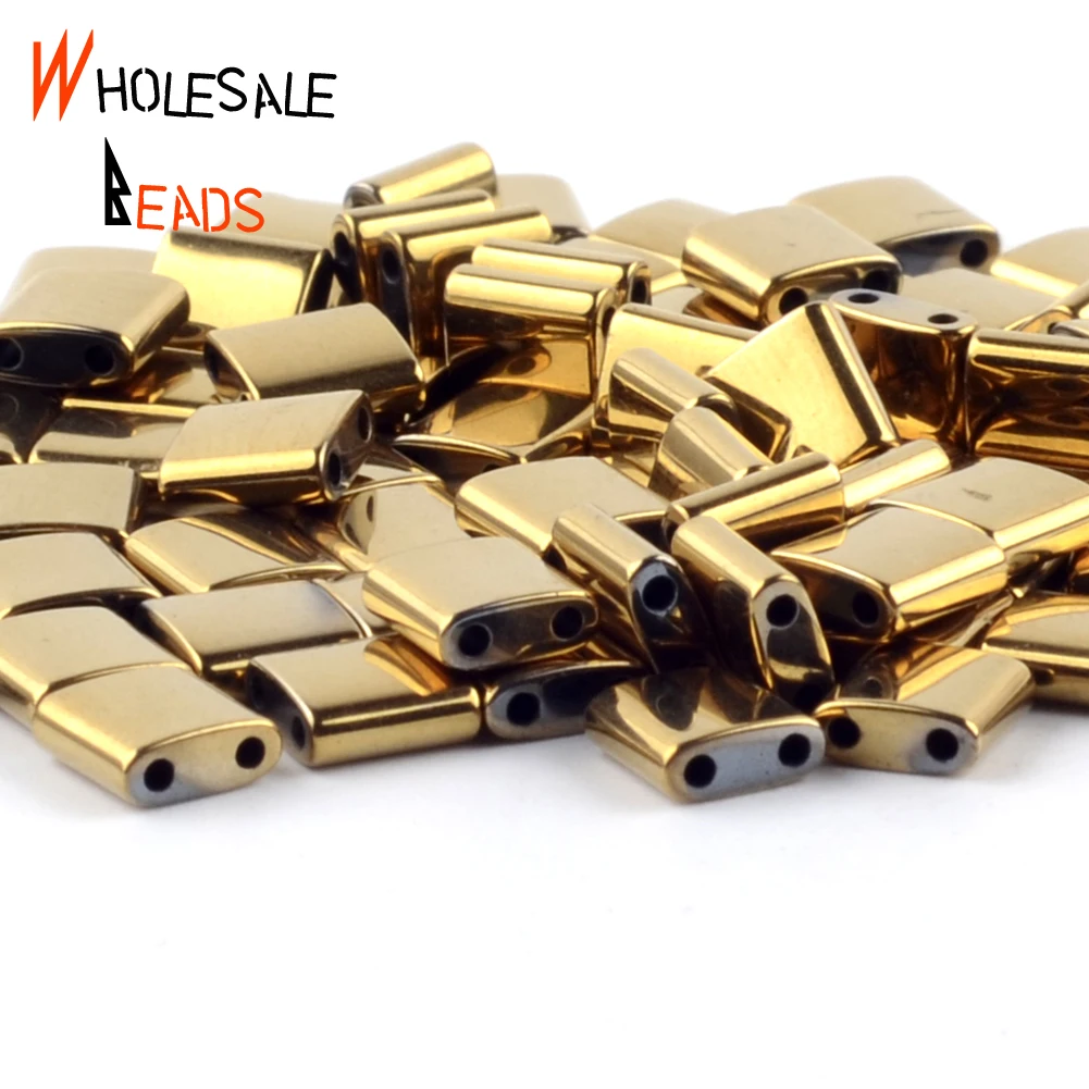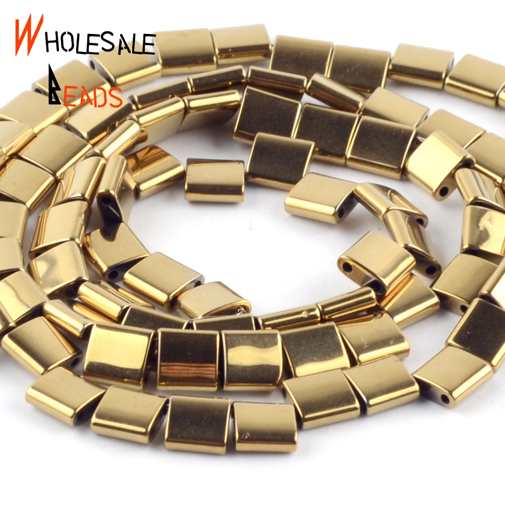 Квадратные позолоченные бусины из натурального камня с двойным отверстием из гематита, незакрепленные бусины для изготовления ювелирных изделий своими руками, аксессуары для браслетов 15 дюймов 6x6 мм