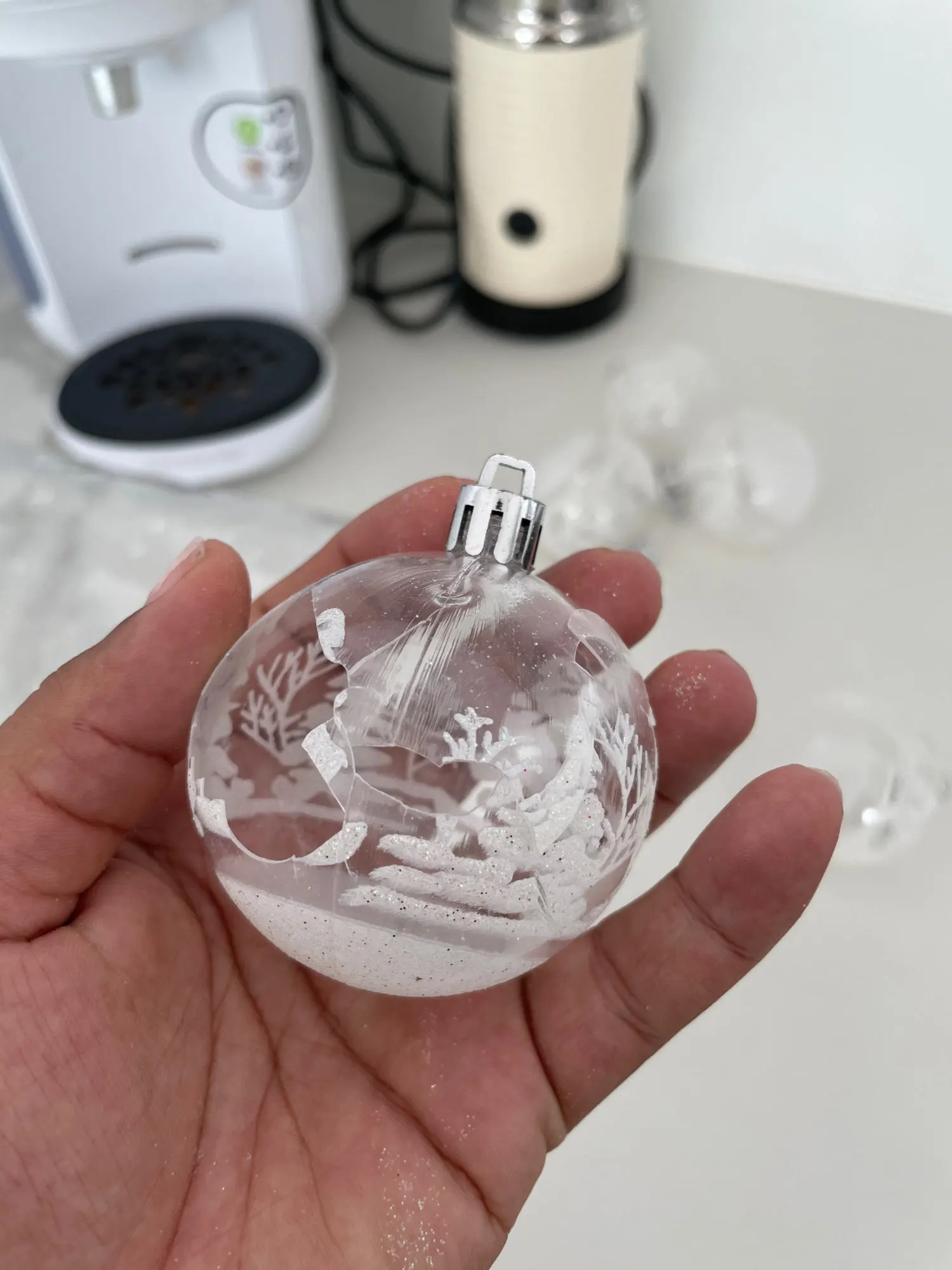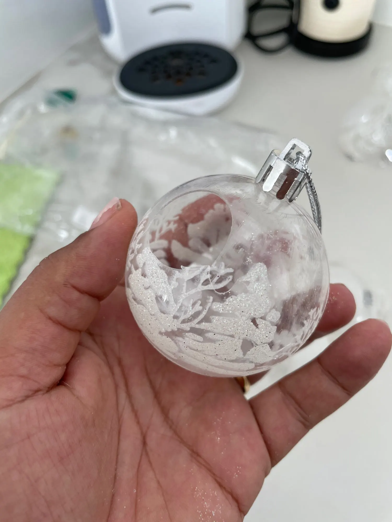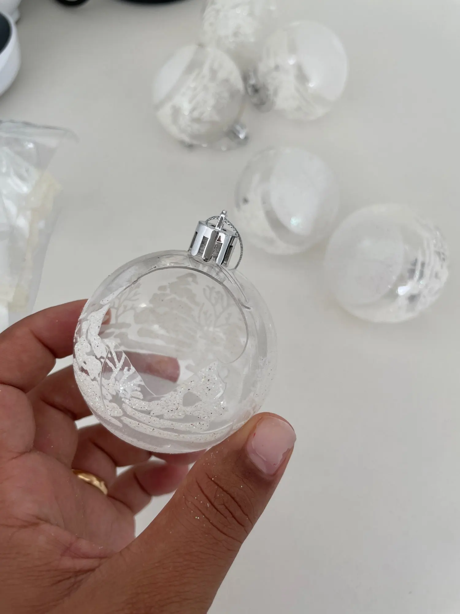 1. Изготовлен из высококачественного пластика, его нелегко повредить и он прочный.2. Подвесной декоративный шар, вы можете повесить его на желаемое место.3. Добавьте праздничной атмосферы Рождеству.4. Легкий и удобный для переноски.5. Можно использовать как рождественский подарок для друзей.6. Подходит для рождественских украшений, елочных украшений и т. д.