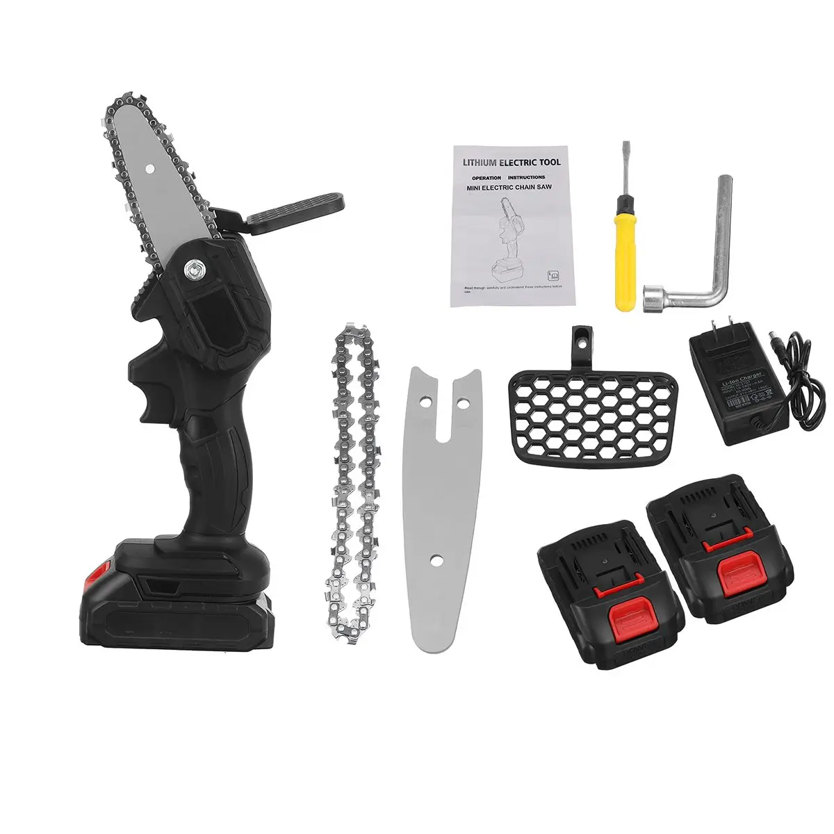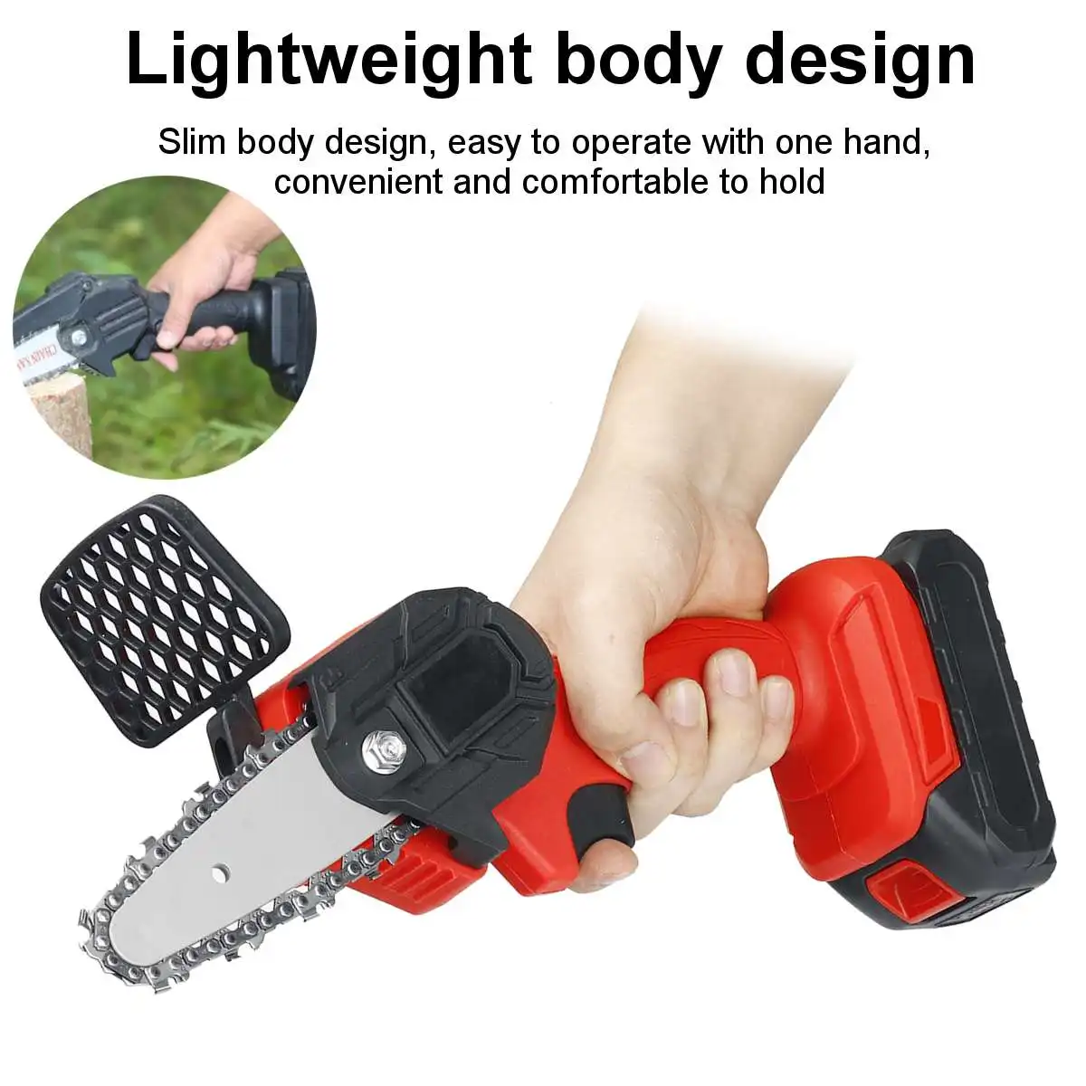 Особенности:-Практичный, быстрая скорость, низкое энергопотребление.-Двигатель из чистой меди, высокая мощность, быстрая резка, повышение эффективности.-Высококачественный переключатель, быстрая и медленная регулировка, плавное изменение скорости.-Высококачественная направляющая пластина, глубокая закалка, более износостойкая, гладкая резка.-Перезаряжаемая Электрическая цепная пила светильник и портативная, долгий срок службы батареи, без повреждения коры.Светильник корпус светильник и удобный светильник дизайн, долгое время держит и не устает руки.-Интеллектуальный плата управления цепью, защита от перегрузки, для удовлетворения различных потребностей в строительстве.-Управление одной рукой: небольшой размер, можно удерживать одной рукой. Вес мини-бензопила всего около 0,7 кг и общая длина всего 33 см (13 дюймов).-Специальная направляющая пластина, шарик из вольфрамовой стали смазывать не нужно, так что машина снижает сопротивление во время работы и снижает износ машины.