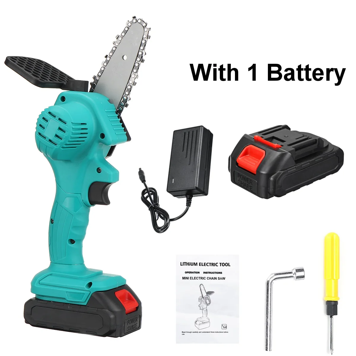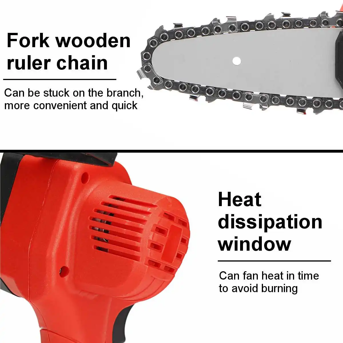 Особенности:-Практичная, быстрая скорость, низкое энергопотребление.-Двигатель из чистой меди, сильная мощность, быстрая резка, повышение эффективности.-Переключатель отличного качества, быстрая и медленная регулировка, плавное изменение скорости.-Высококачественная направляющая цепь, глубокая закалка, более износостойкая, гладкая резка.-Перезаряжаемая Электрическая цепная пила, светильник и портативный, длительный срок службы батареи, без повреждений коры.-Светильник вес тела, светильник и удобный, светильник вес конструкции, долгое время хранения и не устают руки.-Интеллектуальная плата управления цепью, защита от перегрузки, для удовлетворения ваших различных потребностей в конструкции.-Контроль в одной руке: маленький размер, может быть держать одной рукой. Мини-бензопила вес всего около 0,7 кг и общая длина составляет всего 33 см (13 дюймов).-Специальная направляющая пластина, шарик из вольфрамовой стали не нужно смазывать, так что машина уменьшает сопротивление во время работы и уменьшает износ на машине.