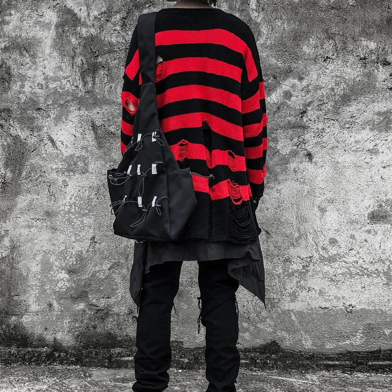 Женский свитер в готическом стиле, вязаные пуловеры в стиле унисекс, джемпер в стиле панк с вырезами и дырками, свободные полосатые свитеры большого размера, топы