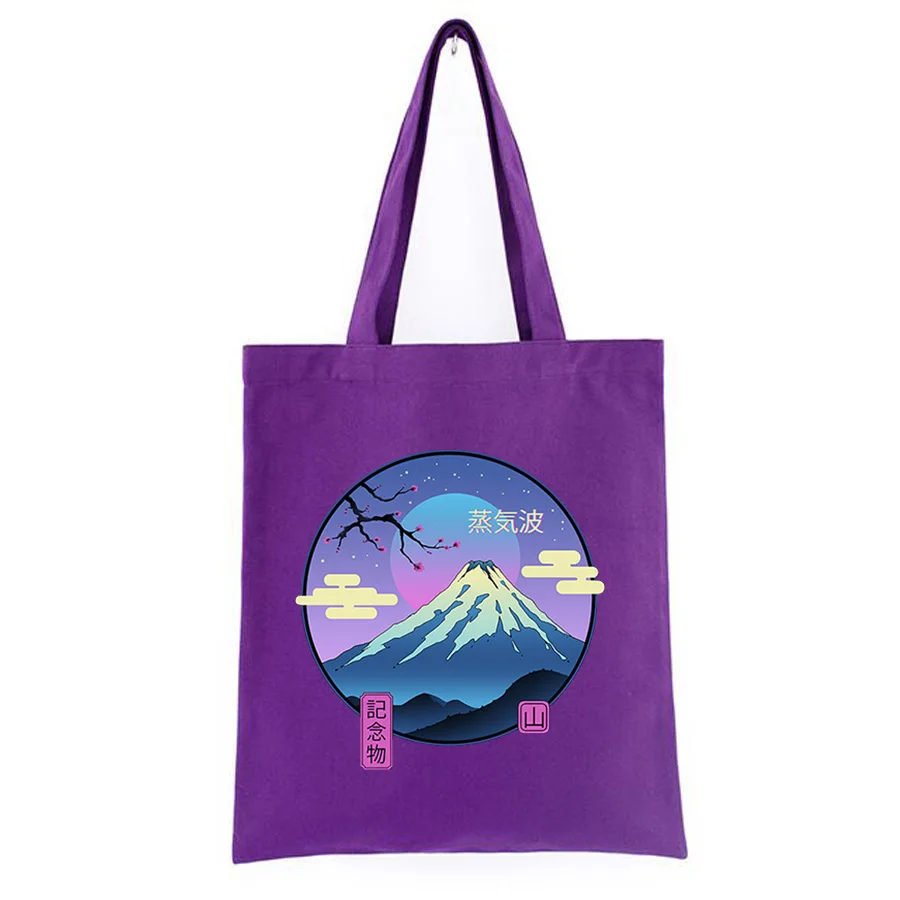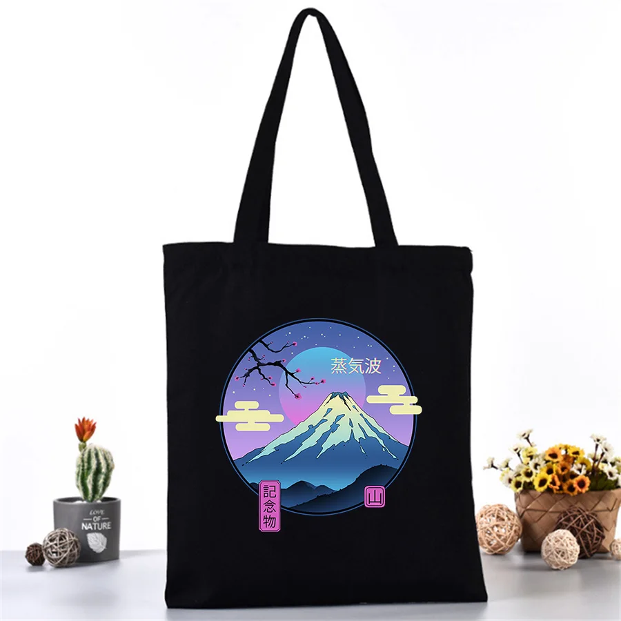 Японская Милая Холщовая Сумка для покупок Vaporwave Mount Fuji, вместительная черная сумка для покупок в стиле аниме, винтажная повседневная женская сумка через плечо