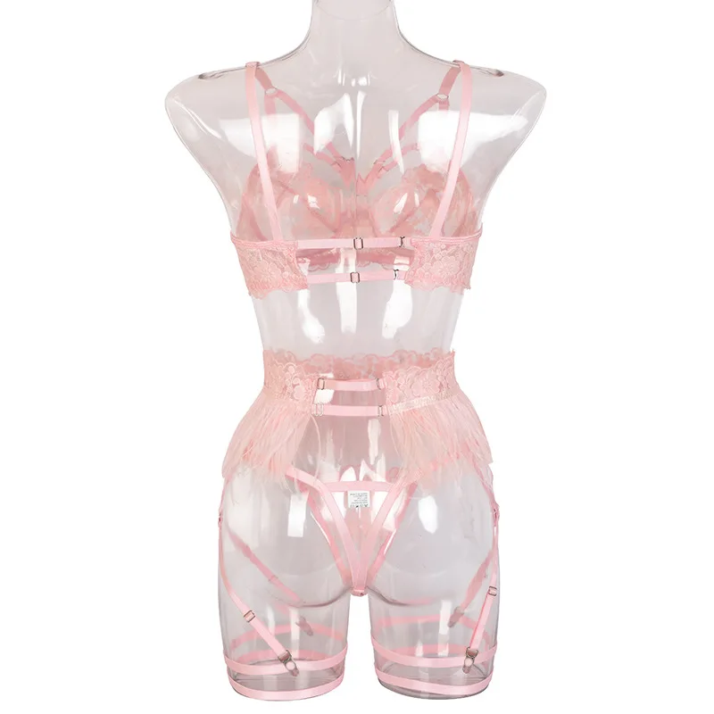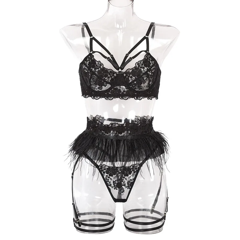 Нижнее белье с перьями, сексуальный женский комплект нижнего белья, комплект нижнего белья с вышивкой, черное нижнее белье, комплект из 3 предметов, кружевное белье с бюстгальтером