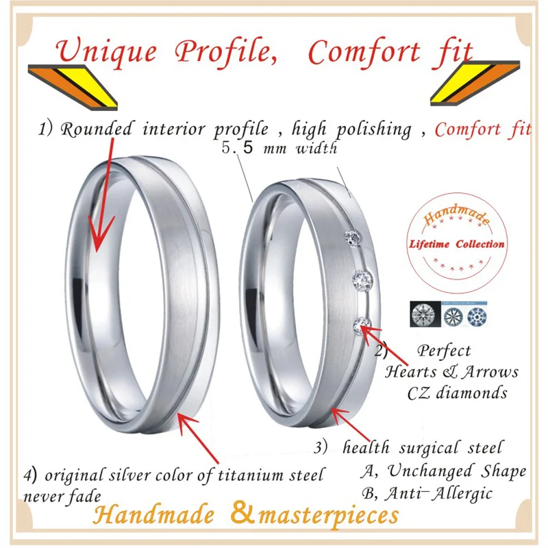 Цена за 1 пару, 2 кольца. Пожалуйста, сначала выберите мужское кольцо. Затем выберите размер женского кольца. Мы отправим вам 2 кольца.1. Материал: титан, хирургическая нержавеющая сталь 316L2, AAA Сердца и стрелы кубический цирконий Алмаз3. Оригинальный цвет титановой стали-серебристый, который никогда не выцветает. Если золотой цвет, то это настоящее ионное покрытие 18 к.Эти обручальные кольца изготовлены из титановой хирургической стали, которые очень прочны и никогда не окисляются и гипоаллергенны.