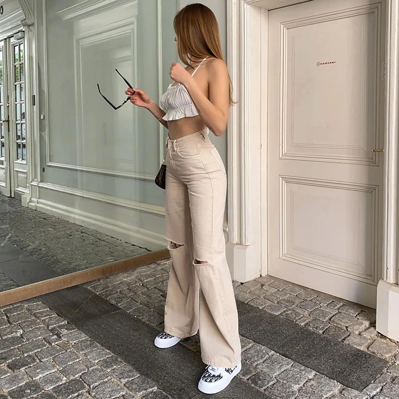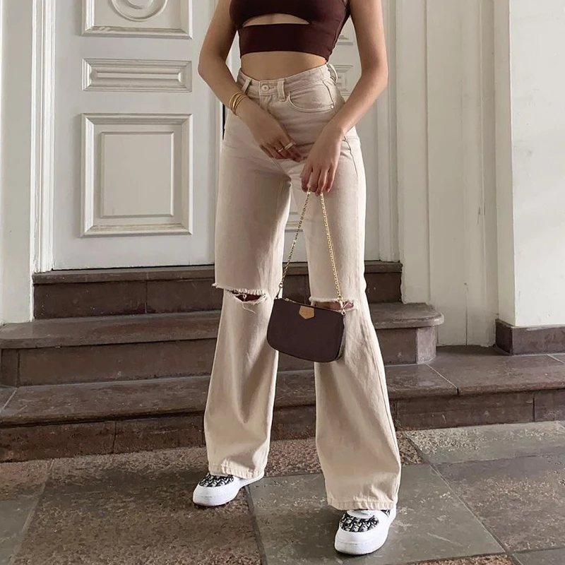 Свободные однотонные рваные джинсы IAMSURE, Повседневная Уличная одежда, брюки с завышенной талией, женские джинсовые брюки с широкими штанинами, 2021, элегантные модные женские