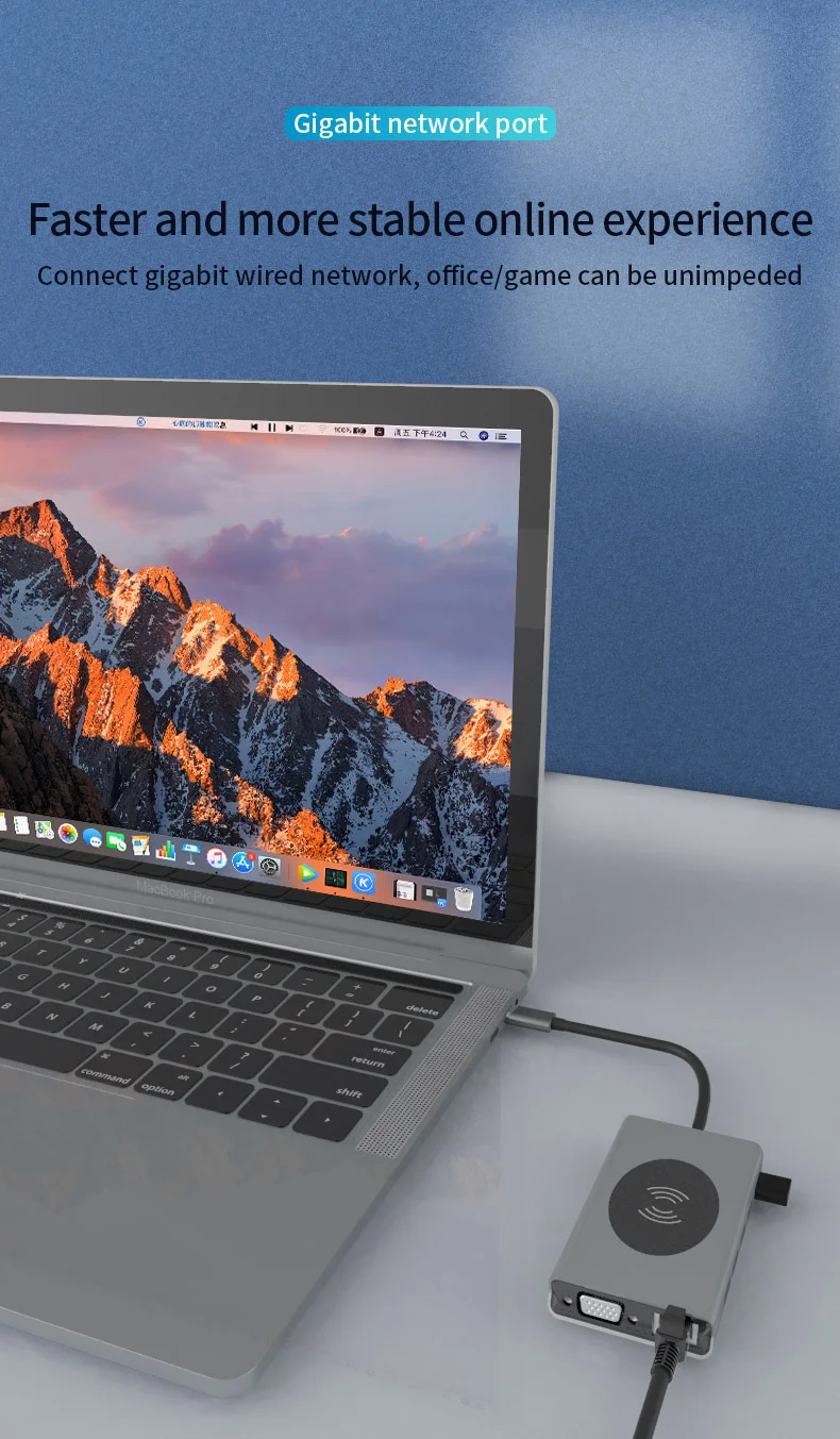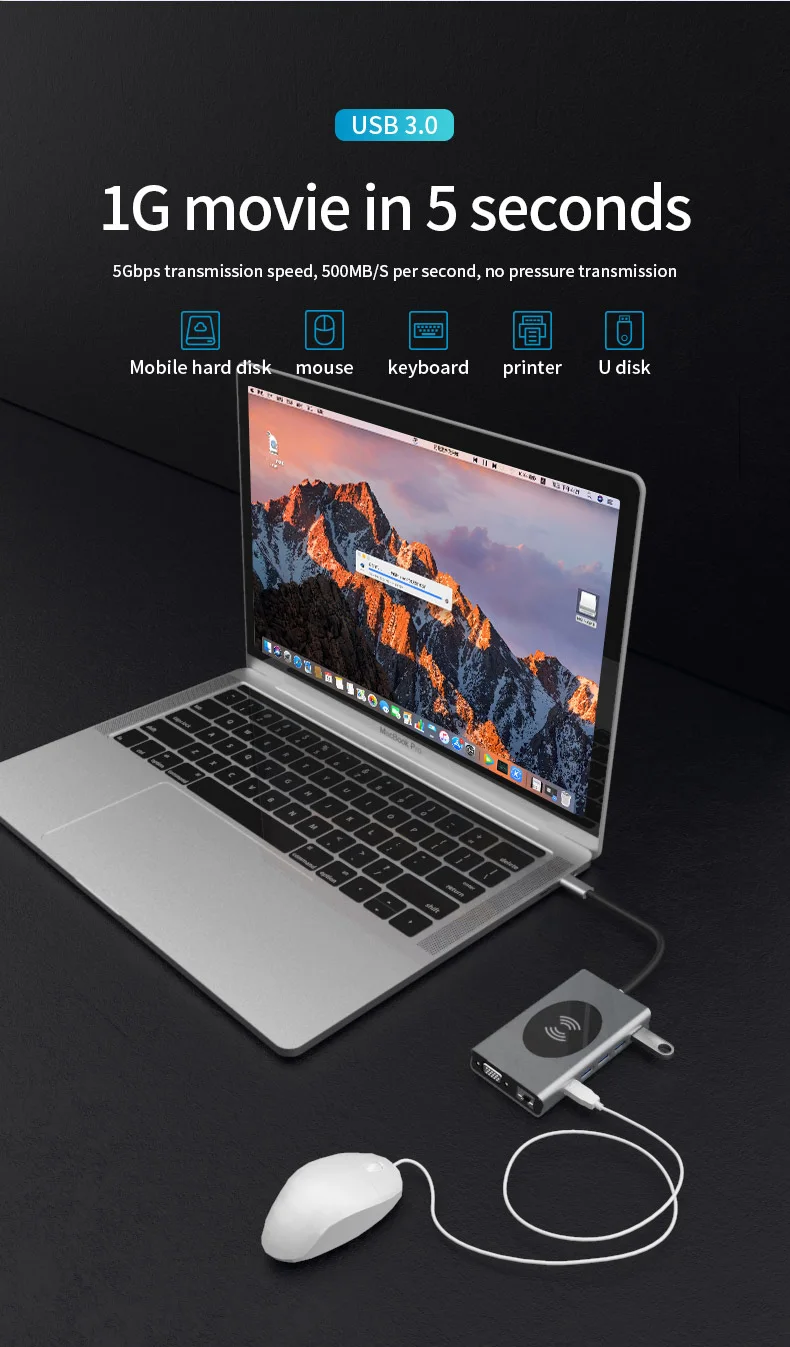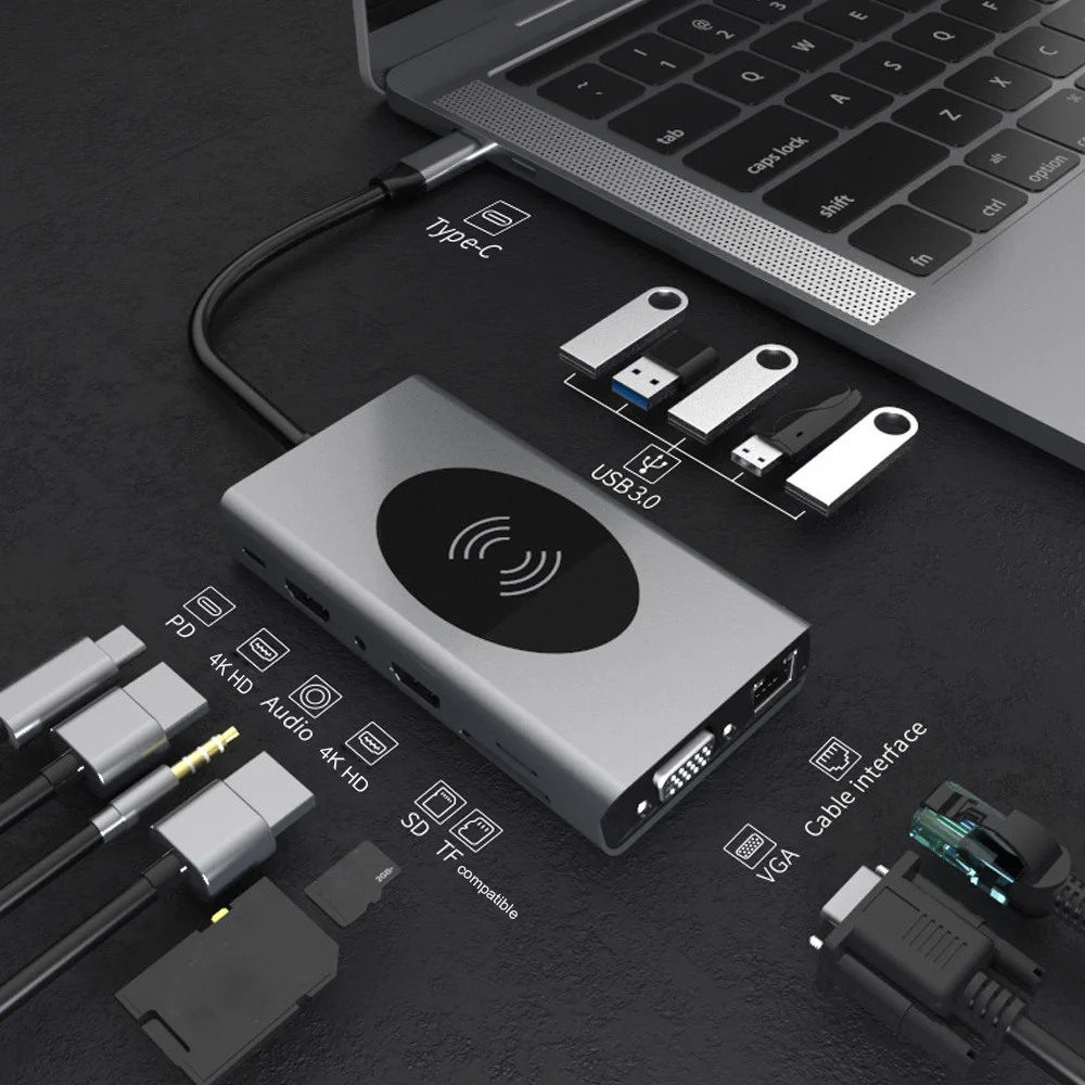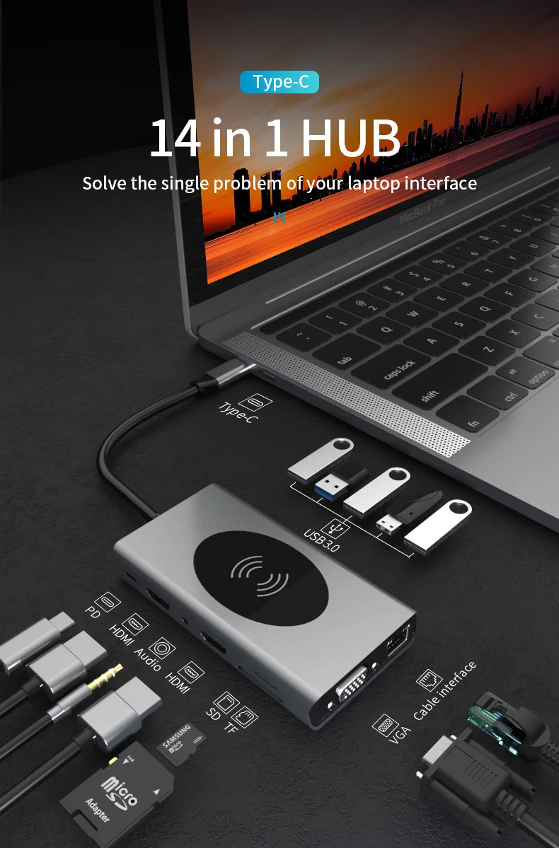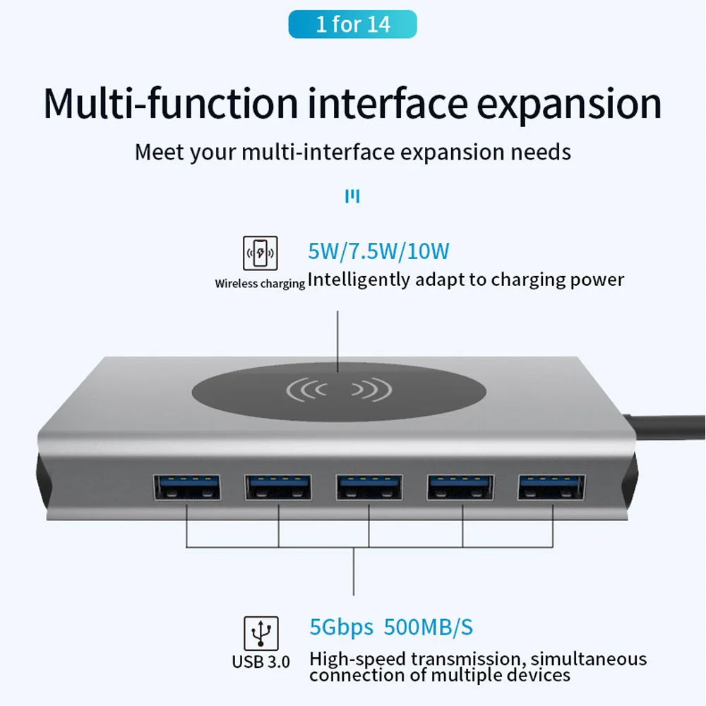 USB-концентратор с Type C на HDMI-совместимый адаптер USB 3,0 15 в 1, док-станция типа C для MacBook Pro Air с беспроводной зарядкой