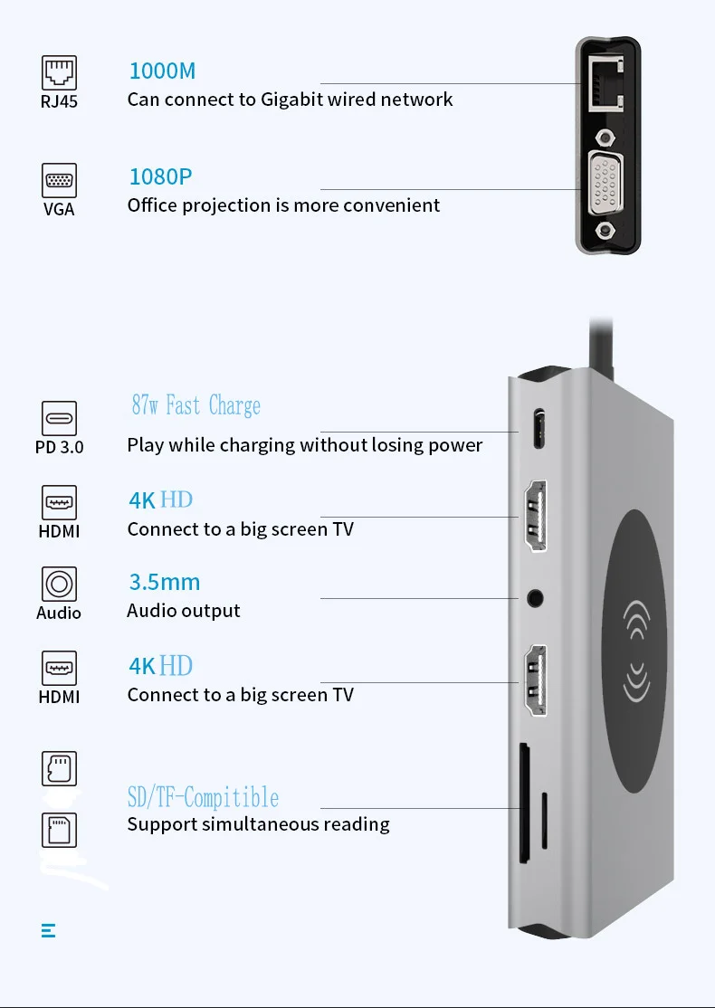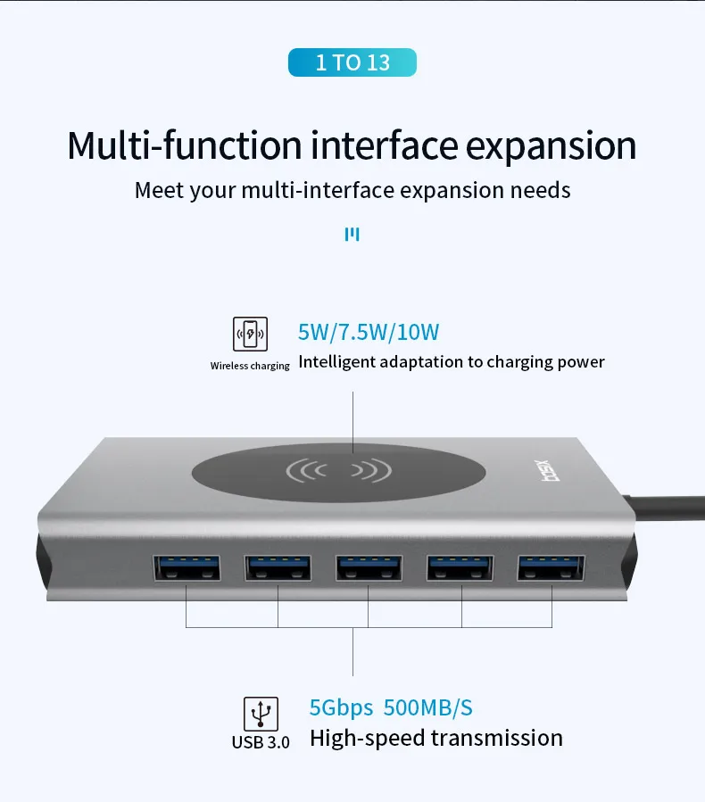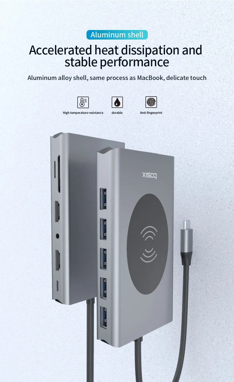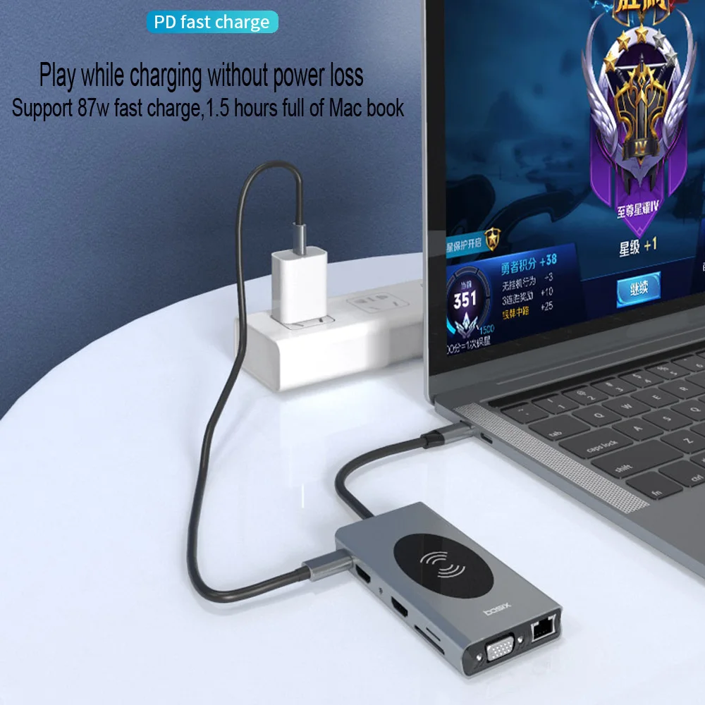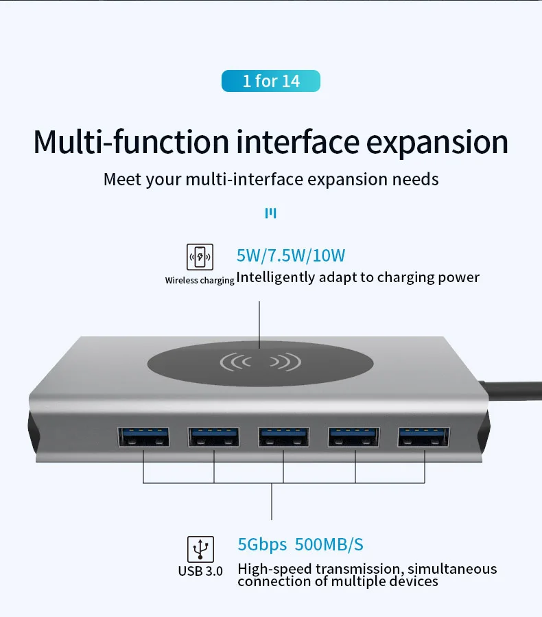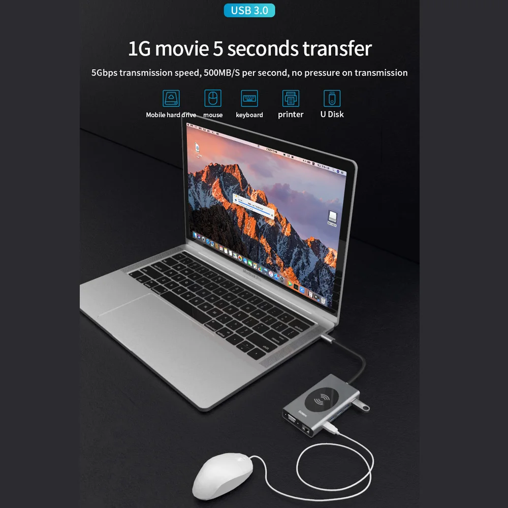 USB-концентратор с Type C на HDMI-совместимый адаптер USB 3,0 15 в 1, док-станция типа C для MacBook Pro Air с беспроводной зарядкой