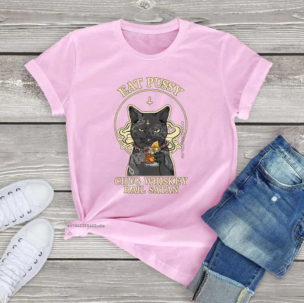 Новинка, футболки из чистого хлопка для женщин, аниме, Черный кот, съесть киски, виски, стиль унисекс, винтажные мужские футболки, женские топы, футболка