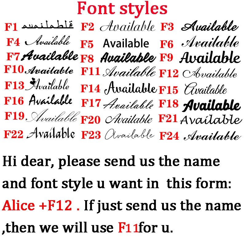 1. Выберите понравившийся стиль шрифта. 2. Пожалуйста, оставьте свойНазваниеИШрифтКогда вы платите. (Например: Regina,font2) 3. Если вы не предлагаете Тип шрифта, мы будем использовать картинный шрифт. Пожалуйста, знайте это.