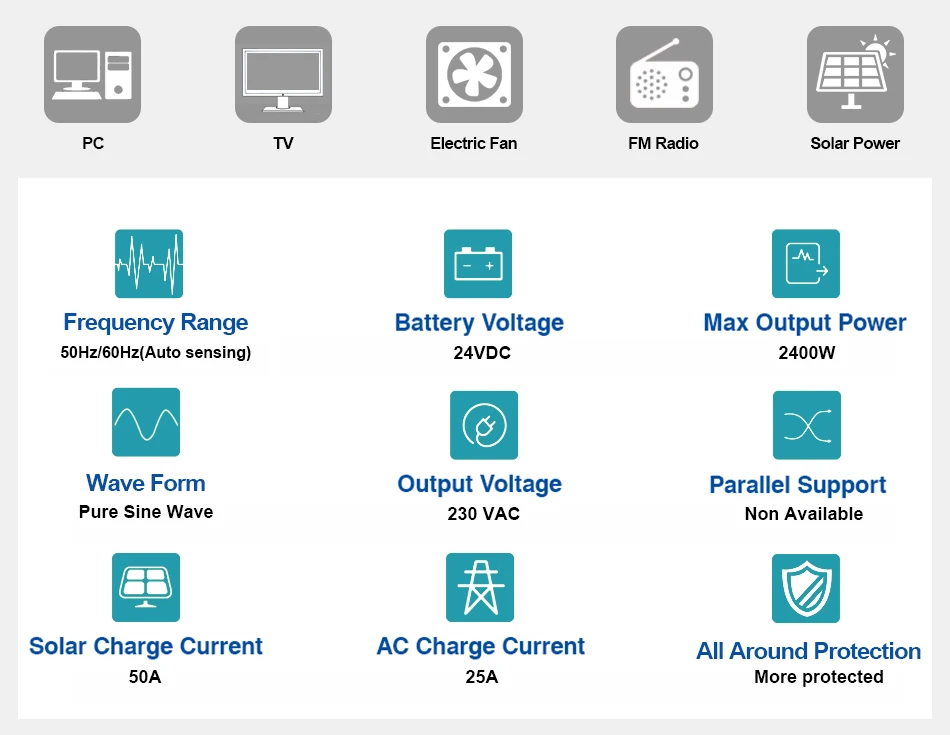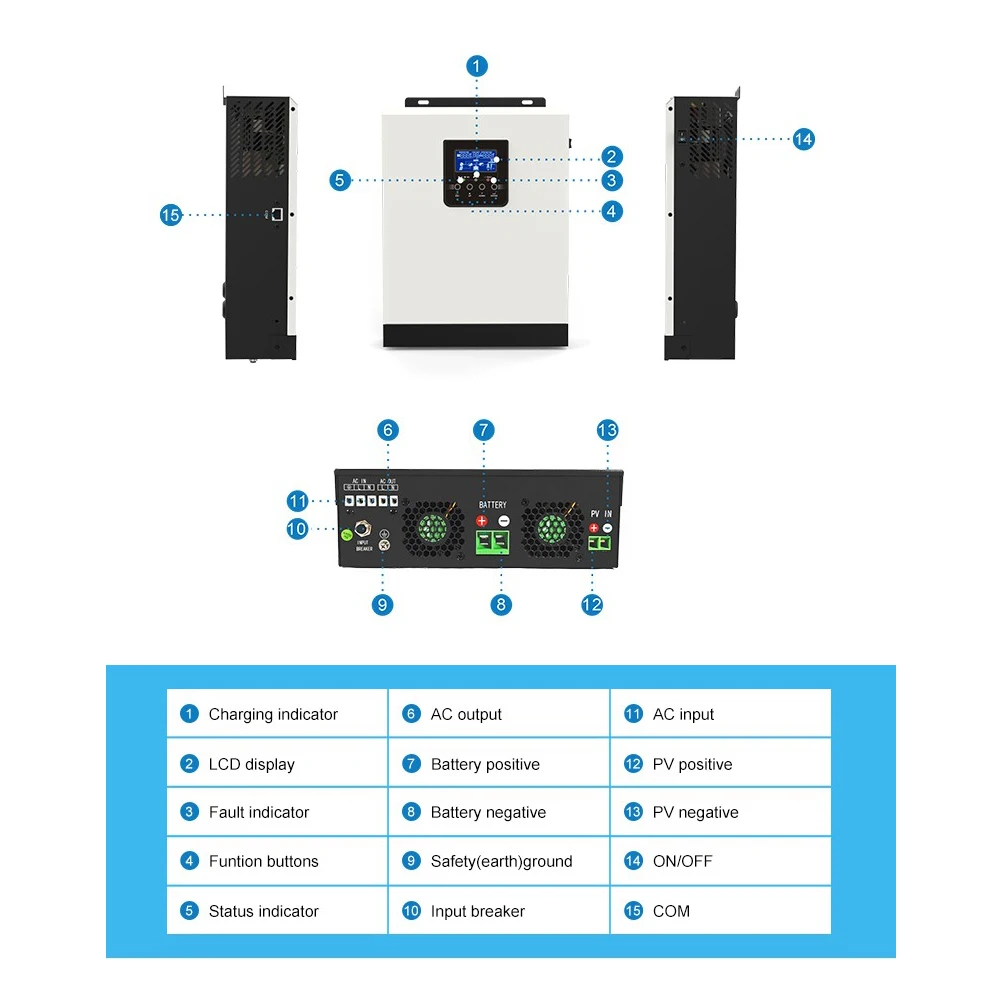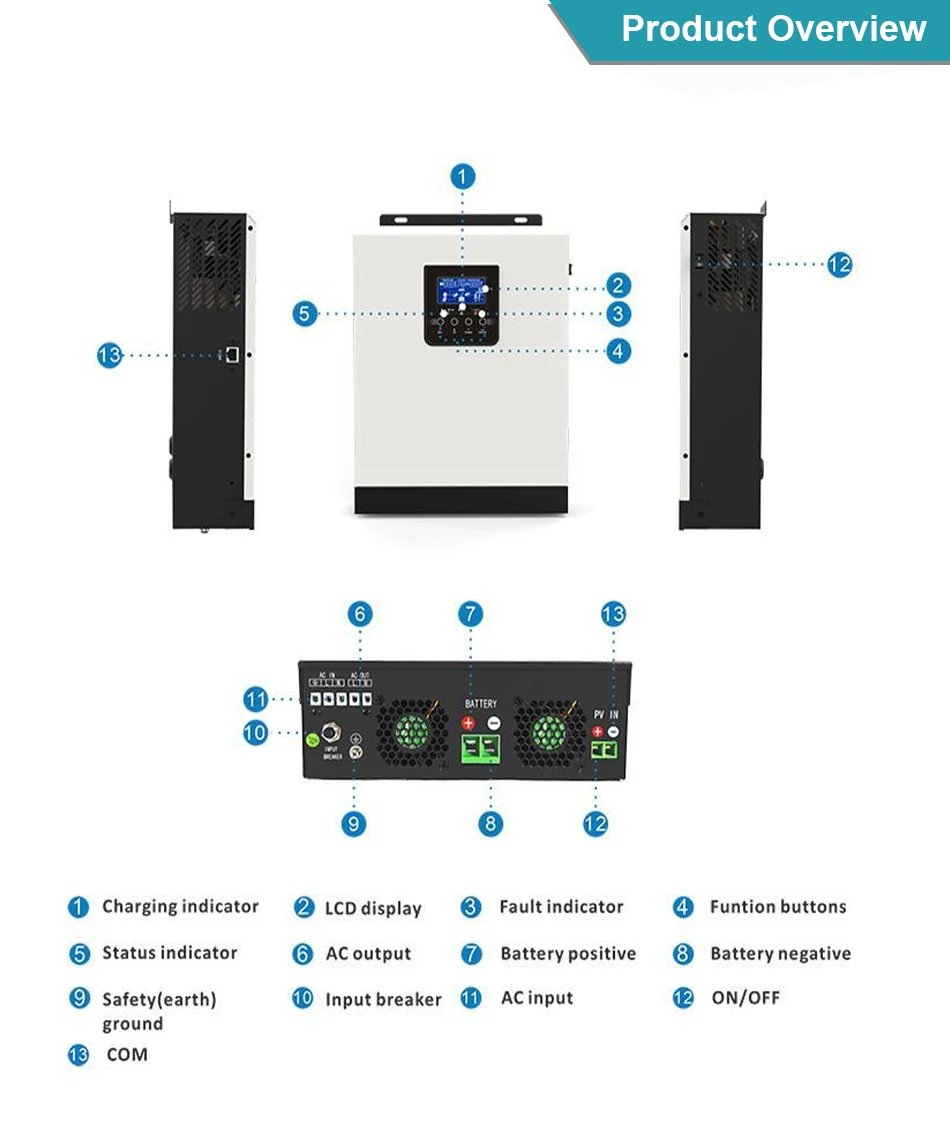 Это многофункциональный инвертор/зарядное устройство, сочетающее функции инвертора, солнечного зарядного устройства и зарядного устройства для обеспечения бесперебойного питания с портативным размером. Его комплексный ЖК-дисплей предлагает настраиваемую и легкодоступную кнопочную работу, такую как ток зарядки аккумулятора, приоритет переменного/солнечного зарядного устройства и Допустимое входное напряжение на основе различных приложений.
