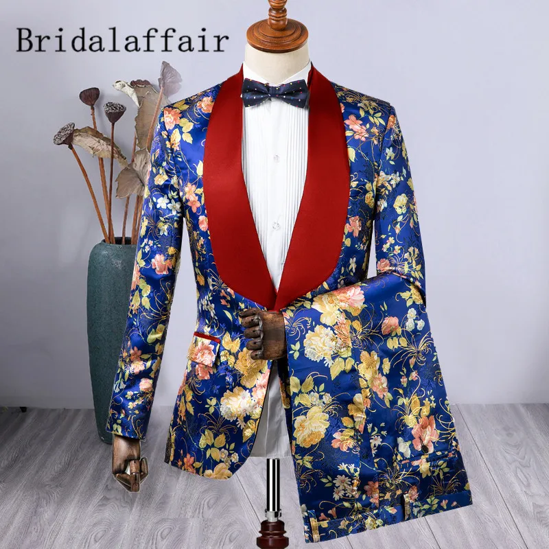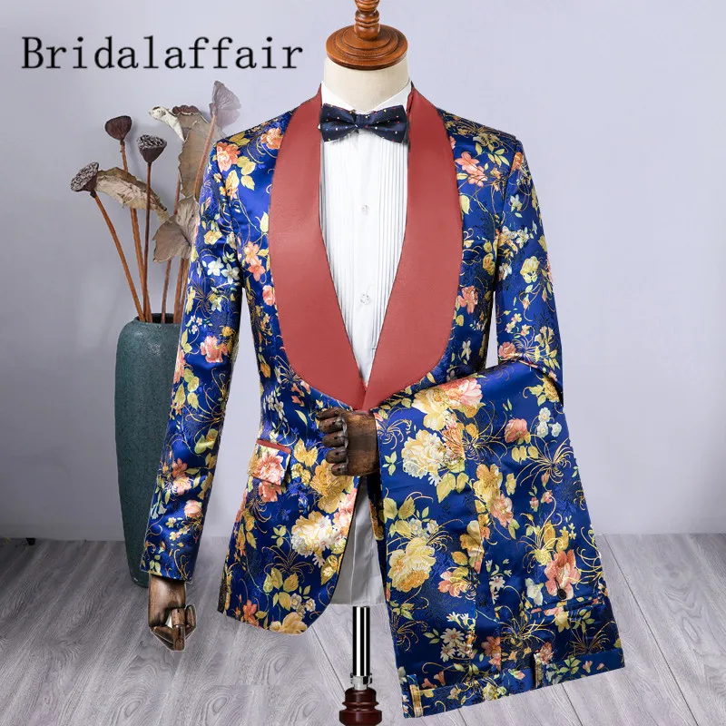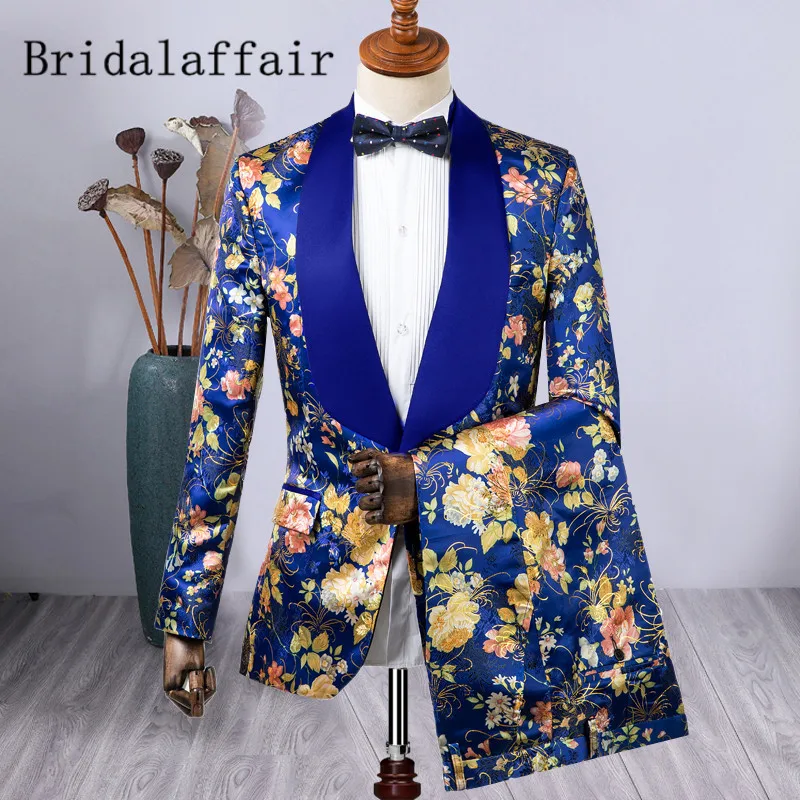 Роскошные мужские свадебные костюмы Bridalaffair, королевский синий костюм для жениха из 2 предметов, платье, смокинг, облегающий блейзер с цветочным принтом и брюки