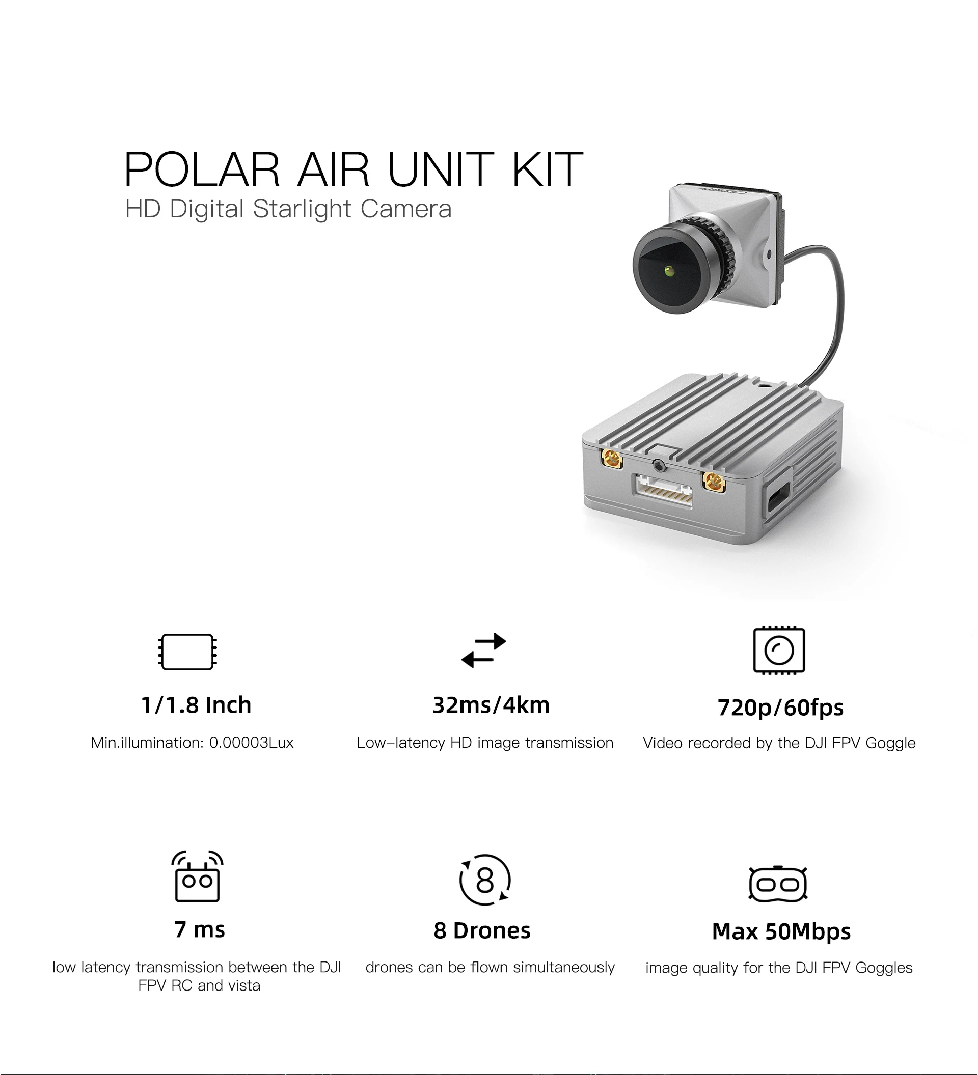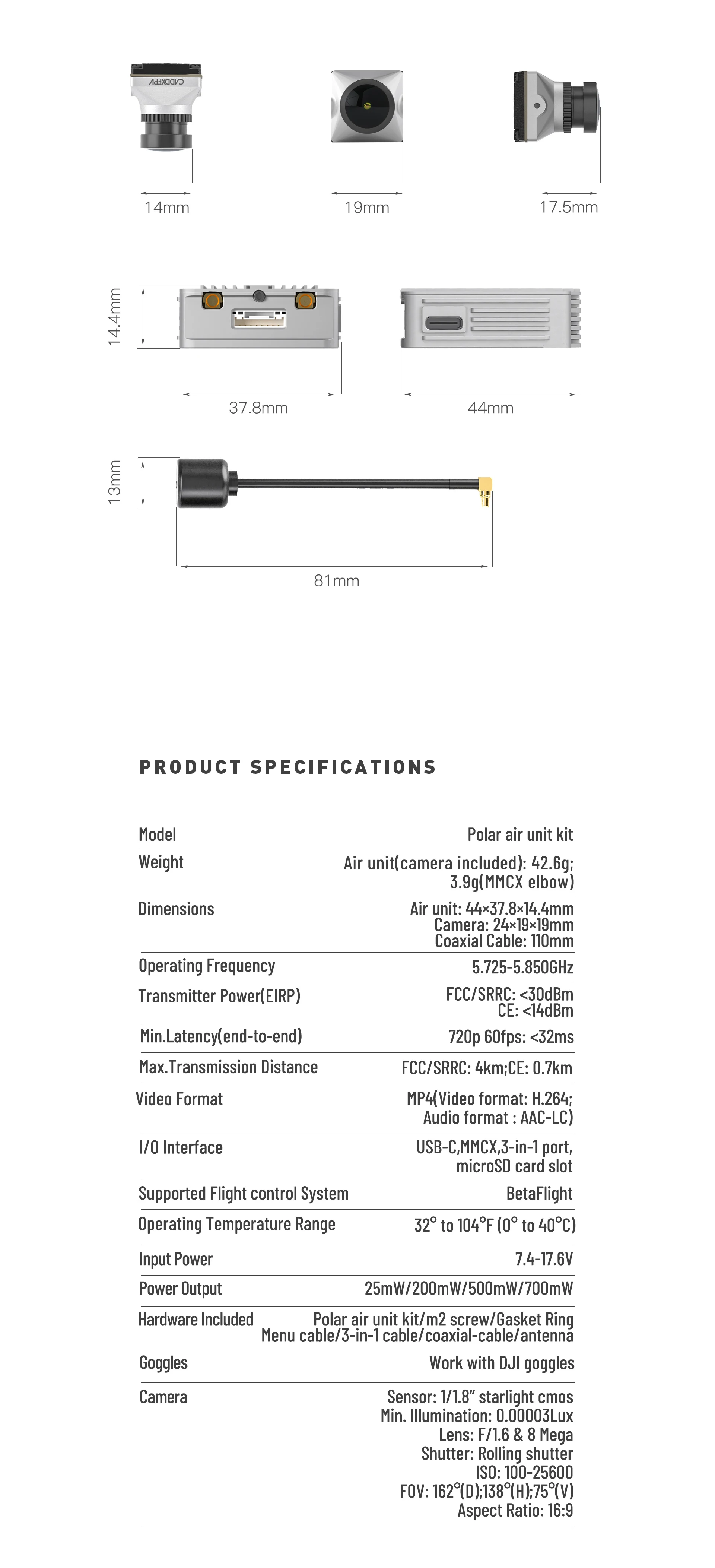 Модель Polar air unit kitВес полярного воздушного блока (включая камеру): 42,6 гАнтенна: 3,9g(MMCX локоть)Размеры воздуха вращающегося вала: 44 × 37,8 × 14,4 ммПолярная Камера: 24 × 19 × 19 ммКоаксиальный кабель: 110 ммАнтенна: 81 ммРабочая частота 5,725-5,850 ГГцМощность передатчика (EIPP) FCC/SRRC: <30dBm;CE: <14dBmМин. Задержка (от конца до конца) 720p 60fps<32msМакс. Расстояние передачи FCC, аддитивного цветового пространства/SRRC:4km CE: 0,7 кмФормат видео MP4 (Формат видео: H.264;Формат аудио: AAC-LC)I/O Интерфейс USB-C,MMCX-3 в 1 порт, слот карты micro SDПоддерживаемая система управления полетом BetaFlightДиапазон рабочих температур от 0 до 40 °C (от 32 до 104 °F)Входная мощность 7,4-17,6 вДатчик изображения 1/1.8 дюймов 2,3 Мега датчик звездного светаОбъектив F/1,6 & 8MegaFOV 162 °(D); 138 °(H); 75 °(V)Мин. Освещение 0.00003LuxСоотношение сторон 16:9