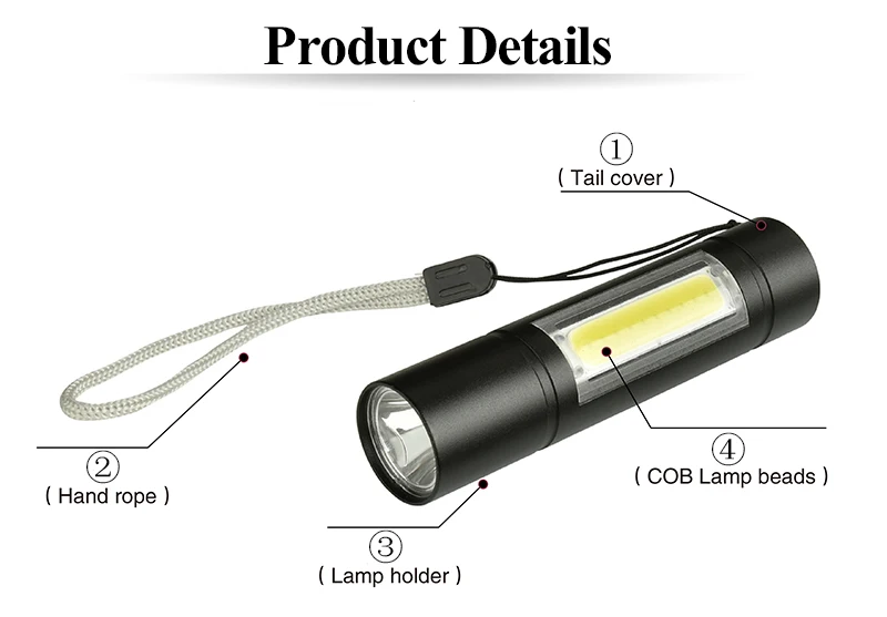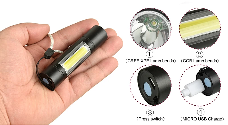 ①. CREE лампа XPE beads ; ②. COB лампы; ③. Нажмите переключатель; ④. Микро USB зарядка;