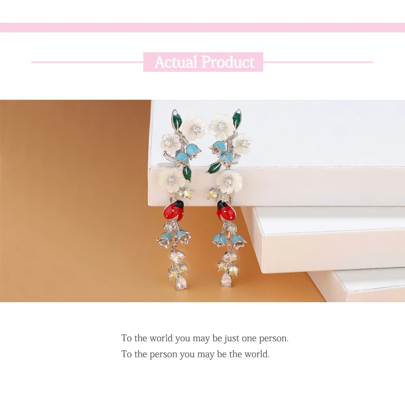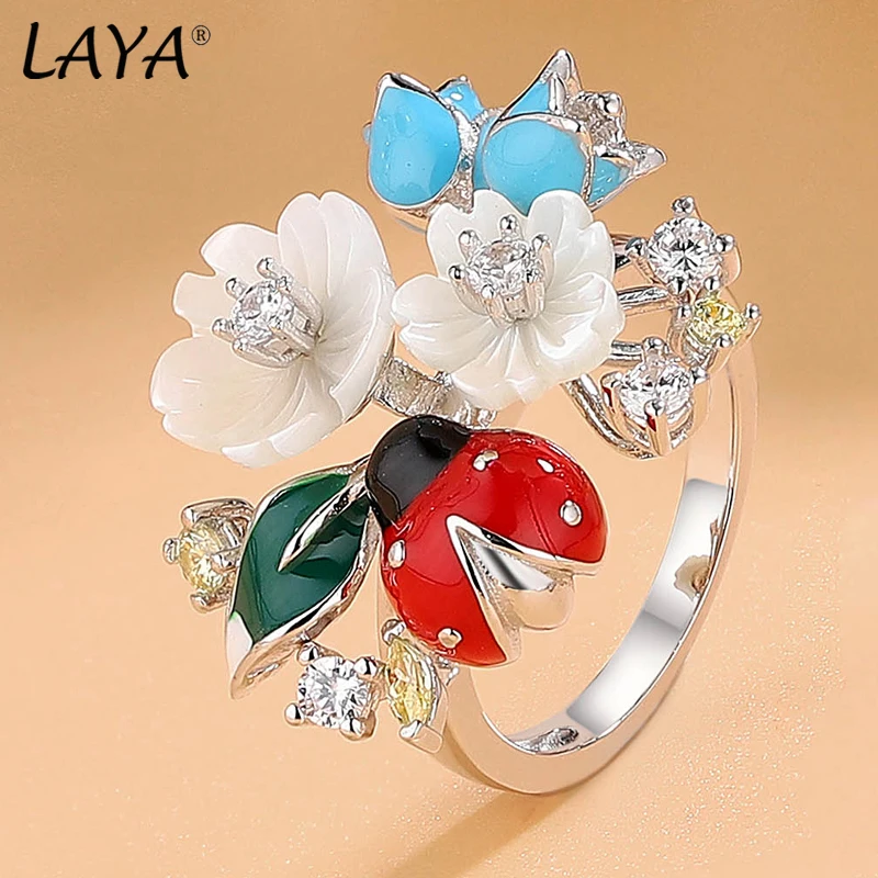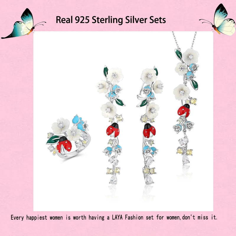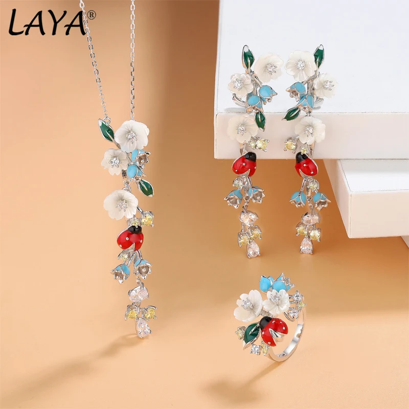 LAYA Стерлингового Серебра 925 Пробы Белый Цветок Зеленый Лист Эмаль Животное Сияющий Циркон Серьги Ожерелье Кольцо Из Трех Частей Свадебные Украшения