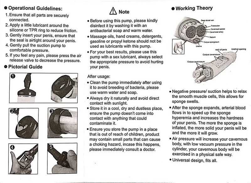 Смазывайте внутреннюю стенку цилиндра и себя. Вставьте пенис в цилиндр. Цилиндр должен оставаться прочно прижатым к основанию вашего пениса, чтобы удержать воздух от побега. Медленно начинайте работу насоса. Будет небольшое ощущение, так как воздух поступает из цилиндра. Для начинающих важно медленно начать этот процесс, чтобы избежать дискомфорта. Не забудьте нажать на предохранительный клапан, если вакуум становится болезненным. Продолжайте накачивать/выпускать воздух до тех пор, пока не найдете подходящий для вас уровень вакуума: Пенис должен выглядеть опухшим, но не должен болеть. Теперь убедитесь, что воздух не ускользнет (если это необходимо) и подождите 20 минут. Вам может потребоваться насос в течение этого времени, чтобы сохранить соответствующее количество вакуума в цилиндре. После завершения сеанса, вы должны выглядеть толще/длиннее и иметь повышенную чувствительность. Эти результаты эффективны в течение 24 часов, но вы можете испытать постоянные результаты с помощью долгосрочного использования. Мы рекомендуем 3-4 сеанса в неделю.