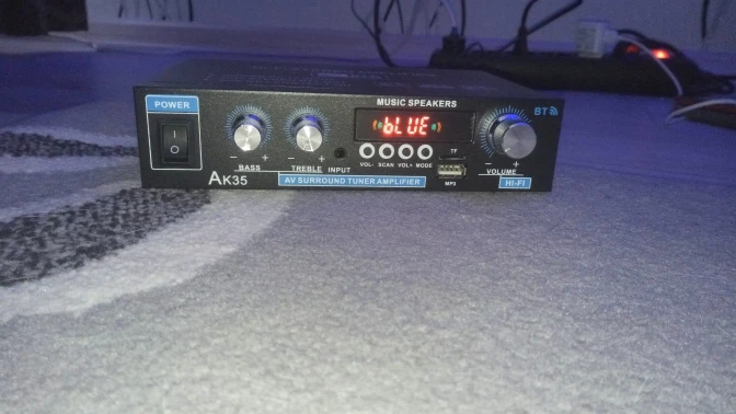 AK35 Bluetooth-совместимый HiFi стерео аудио усилитель мощности двухканальный усилитель мощности с USB TF RCA AUX вход + пульт дистанционного управленияХарактеристика:Мини Высококачественный цифровой Bluetooth-совместимый аудио усилитель мощности.Поддержка tf-карты, AUX, USB флэш-накопитель, воспроизведение формата MP3 и беспроводное соединение с поддержкой Bluetooth.Поддержка TF стерео радио.С высокими частотами, басами и регулятором громкости, он очень прост в использовании.Низкое Искажение обеспечивает более четкий, сильный и мощный звук.Два основных выходных канала.С функцией дистанционного управления.Источник питания постоянного/переменного тока, подходит для дома или автомобиля.Модернизированный высокой мощности 90 Вт + 90 Вт-может автоматически переключаться напряжение, низкая теплоотдача, светильник вес. Спецификация:Тип штепсельной вилки: США, ЕС (опционально)Напряжение: 220 В переменного токаСопротивление: 4-16ΩРазъем, совместимый с Bluetooth: поддержкаМощность RMS: 30 ВтМаксимальная мощность: 90 ВтСопротивление: 4-16ΩКанал: 2,0SNR: 85 дБЧастота fm: 87,5-108 МГцЧастота искажений: 0.05%Частота: 10 Гц-20 кГцРазмер изделия: 190*125*45 ммВес изделия: 900 гРазмер упаковки: 200*170*65 ммПосылка Вес: 1200 г Примечание:Возможны незначительные отклонения в размере из-за ручного измерения, различных методов измерения и инструментов.Изображение может не отражать фактический цвет изделия из-за различного фотографирования светильник, угол и дисплей монитора.Упаковка:1 х усилитель мощности1 х адаптер питания1 пульт дистанционного управления1 х Руководство