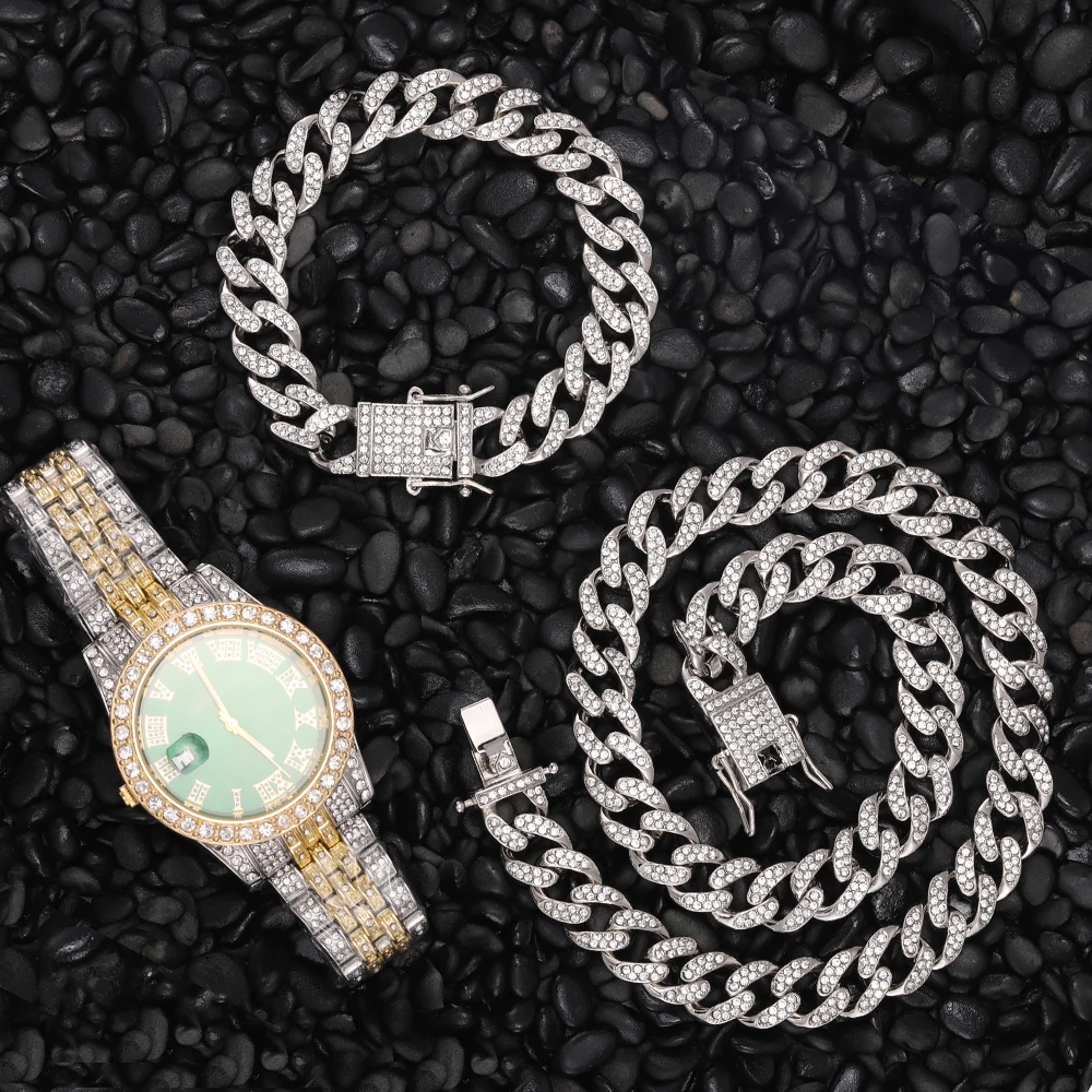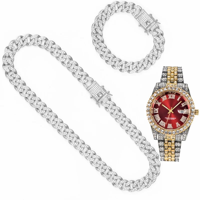 Ожерелье + часы + браслет в стиле хип-хоп МАЙАМИ панцирная кубинская золотая цепочка со сверкающими фианитами для мужчин ювелирные изделия 24 дюйма